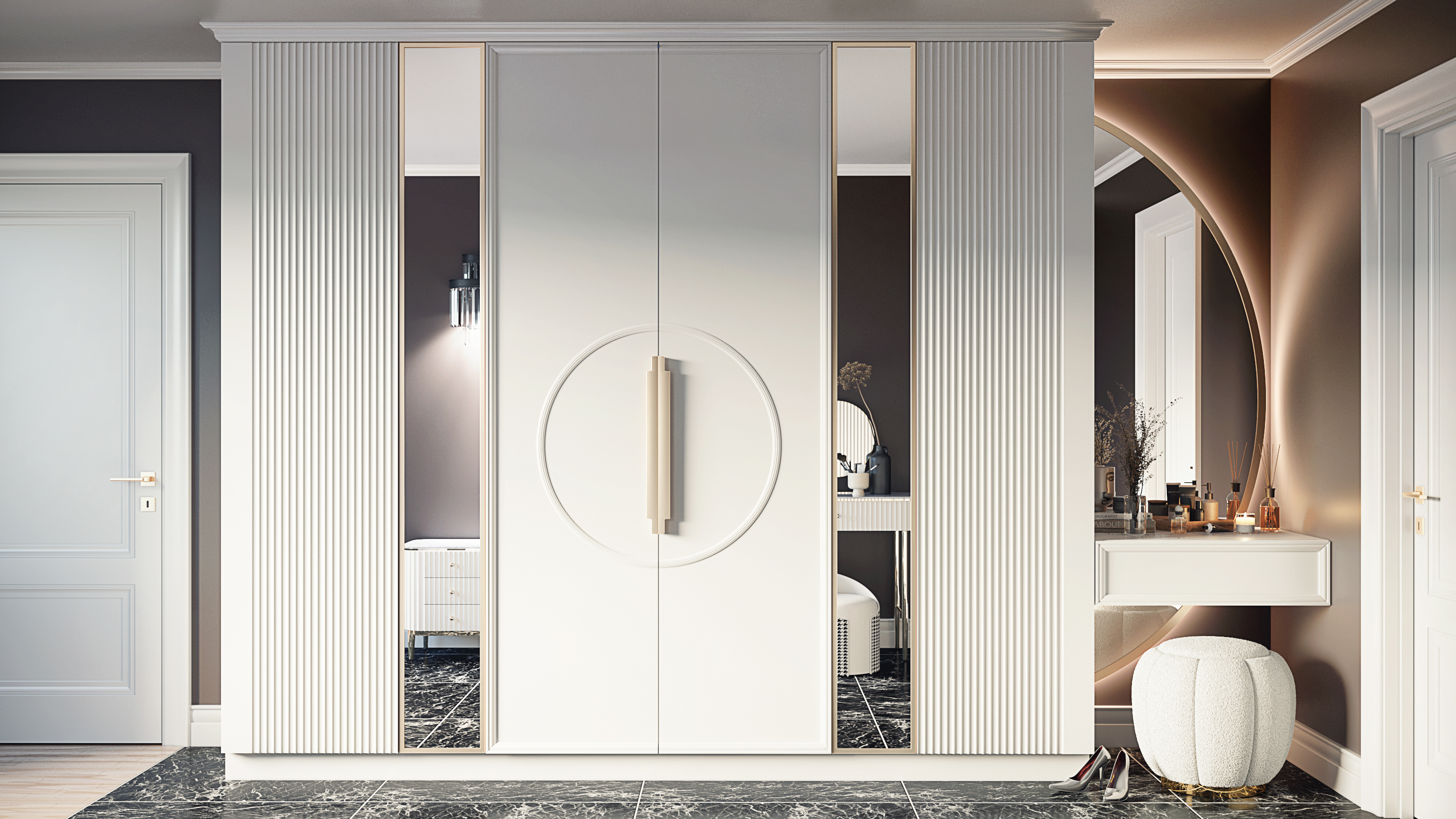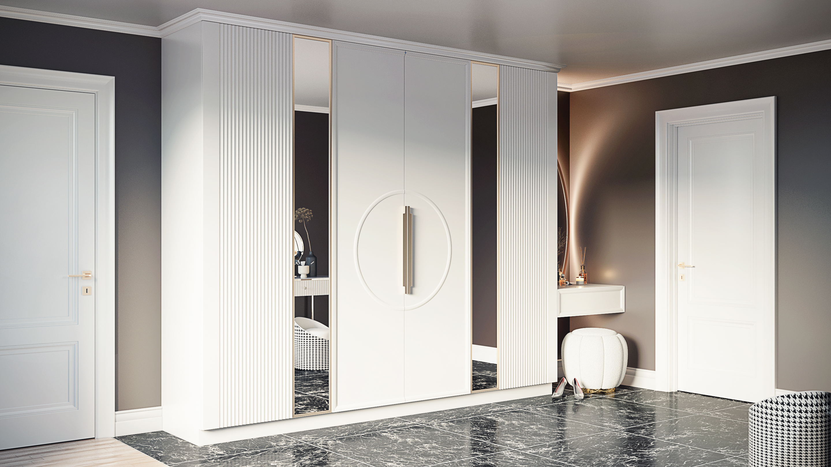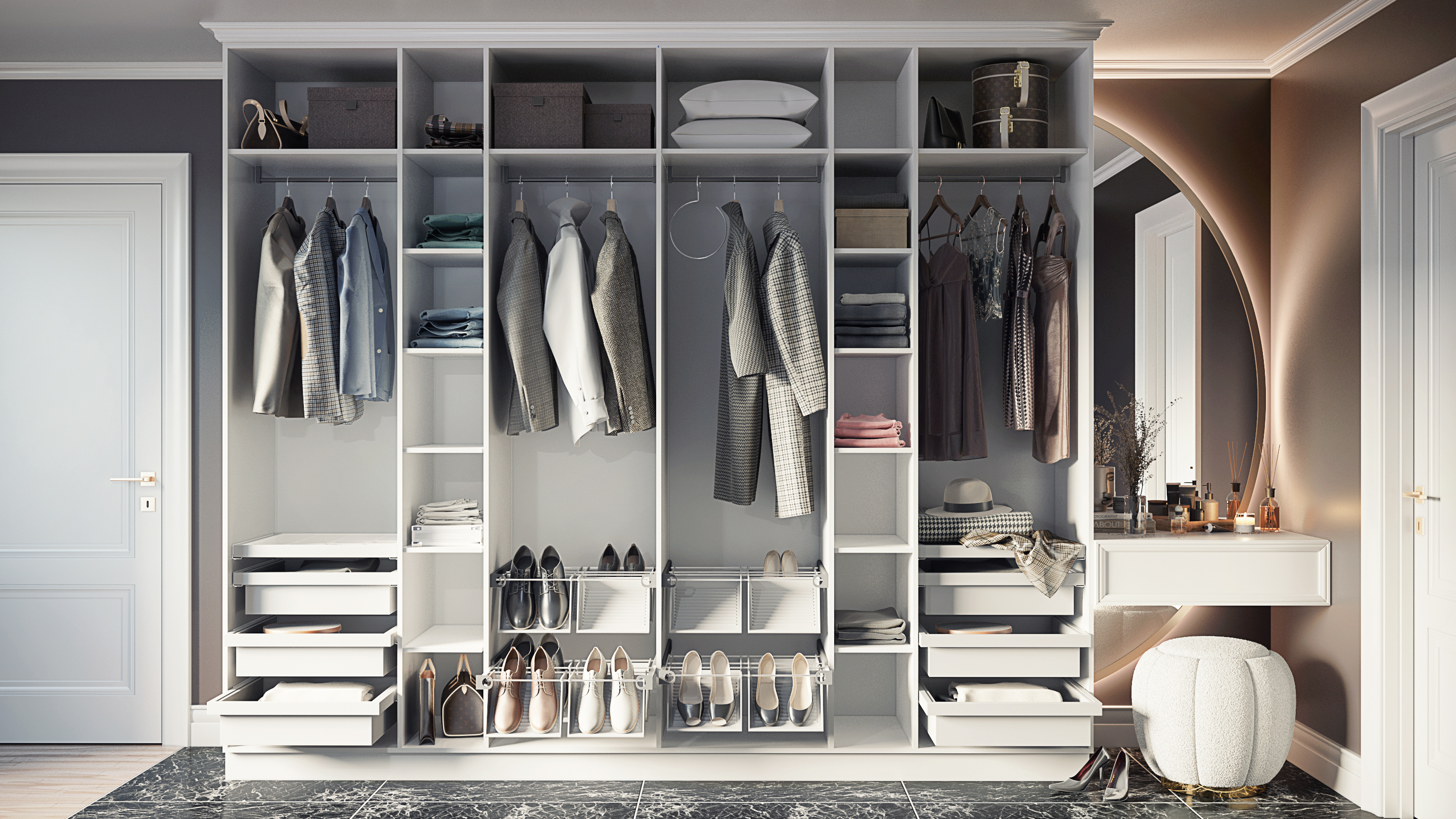 Идеальный образец шкафа в неоклассическом стиле. Она наилучшим образом сочетает в себе элементы классического стиля и яркие нотки современности.