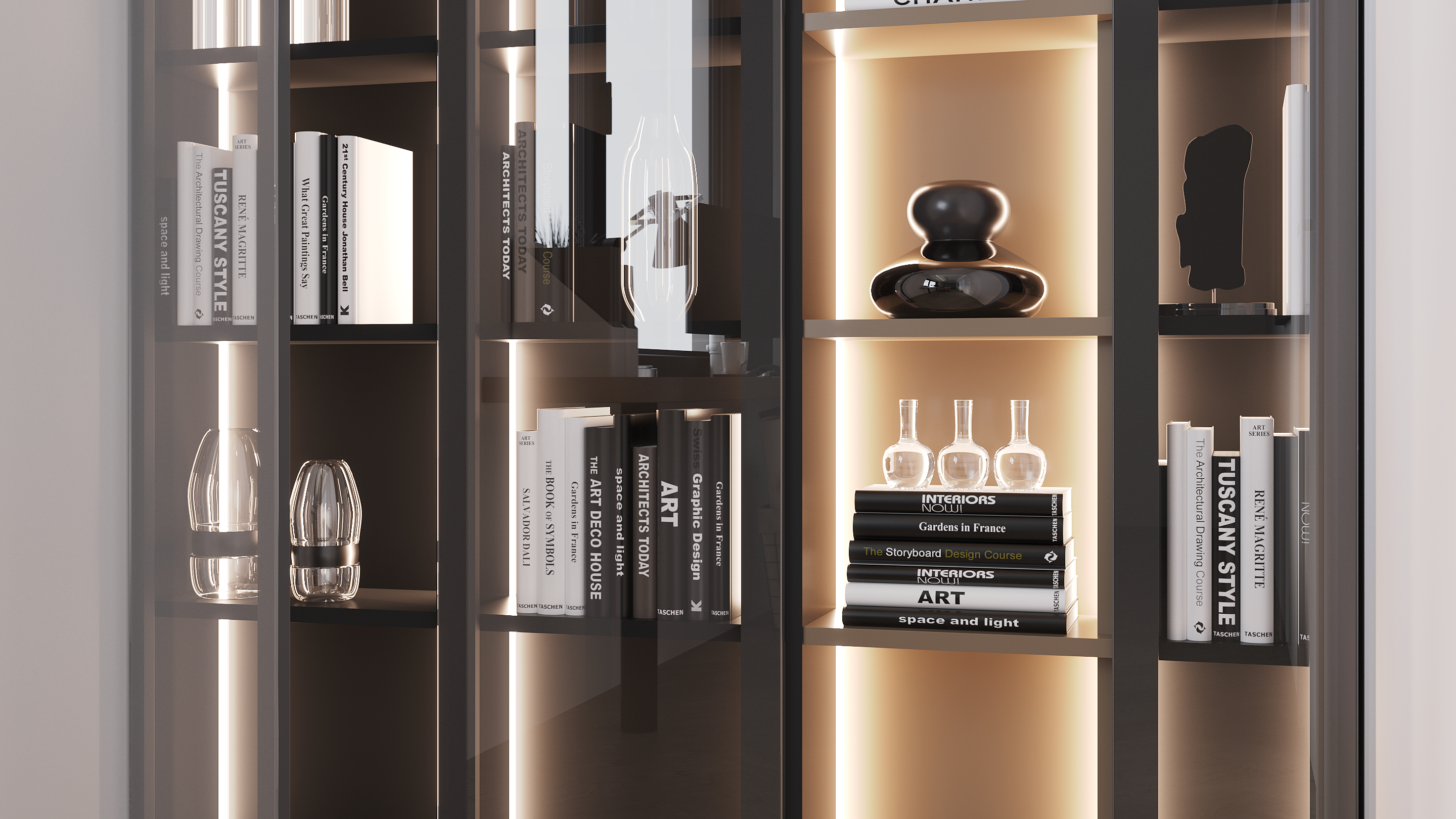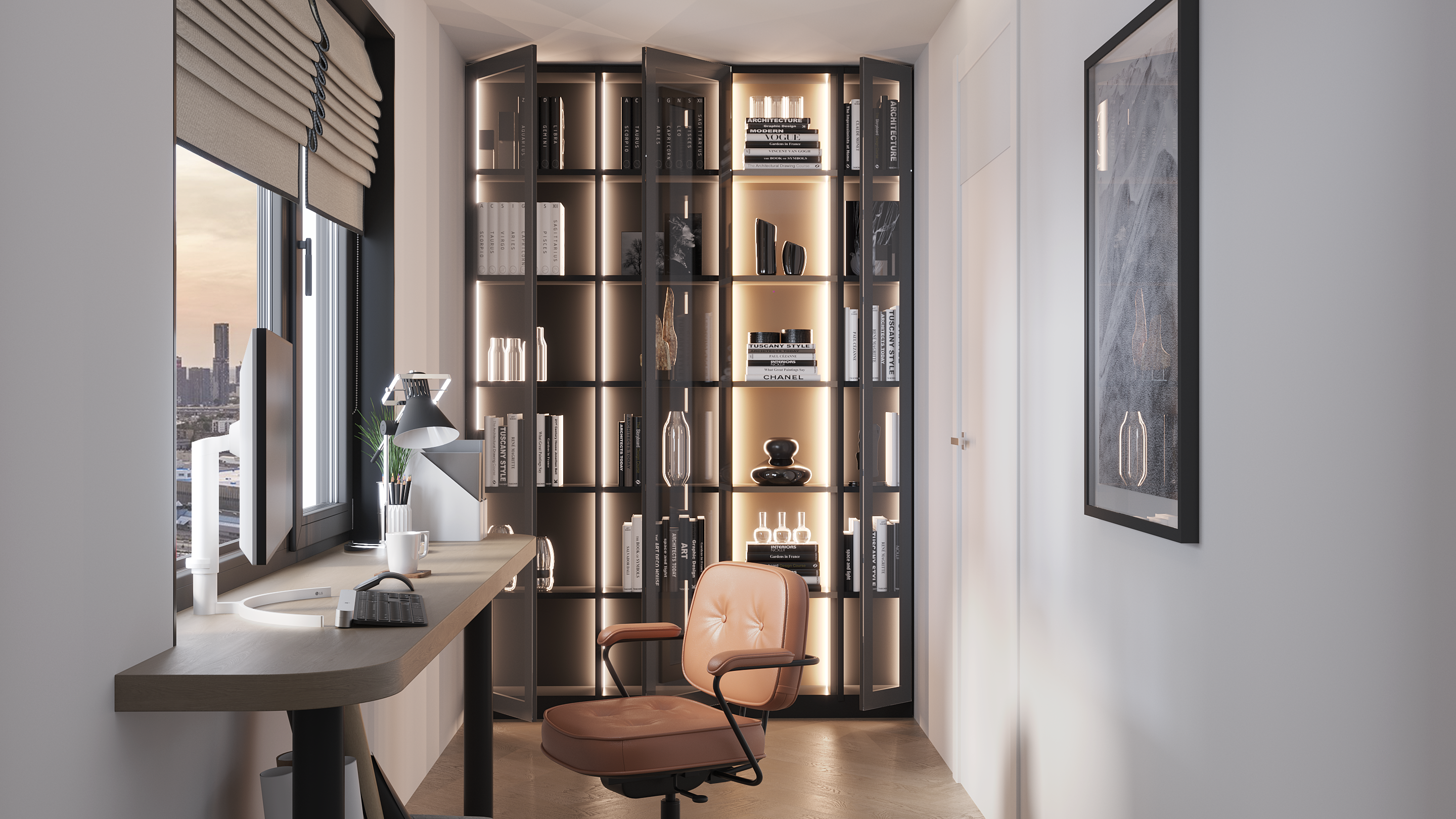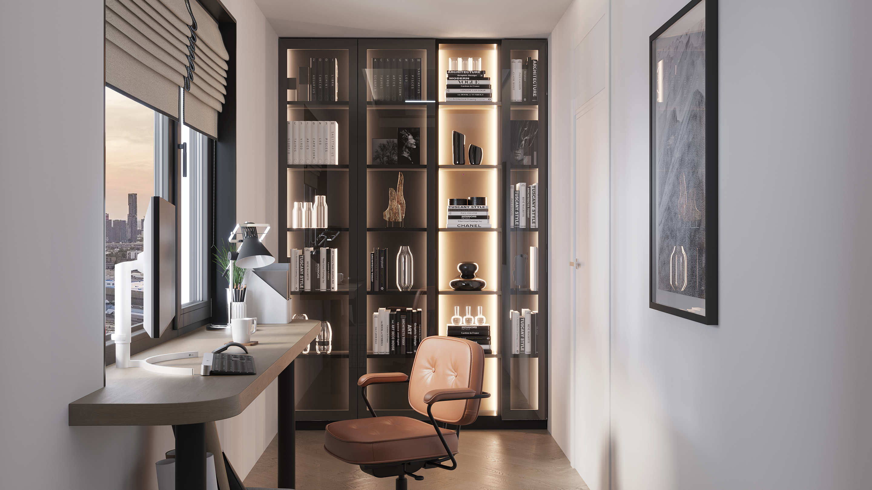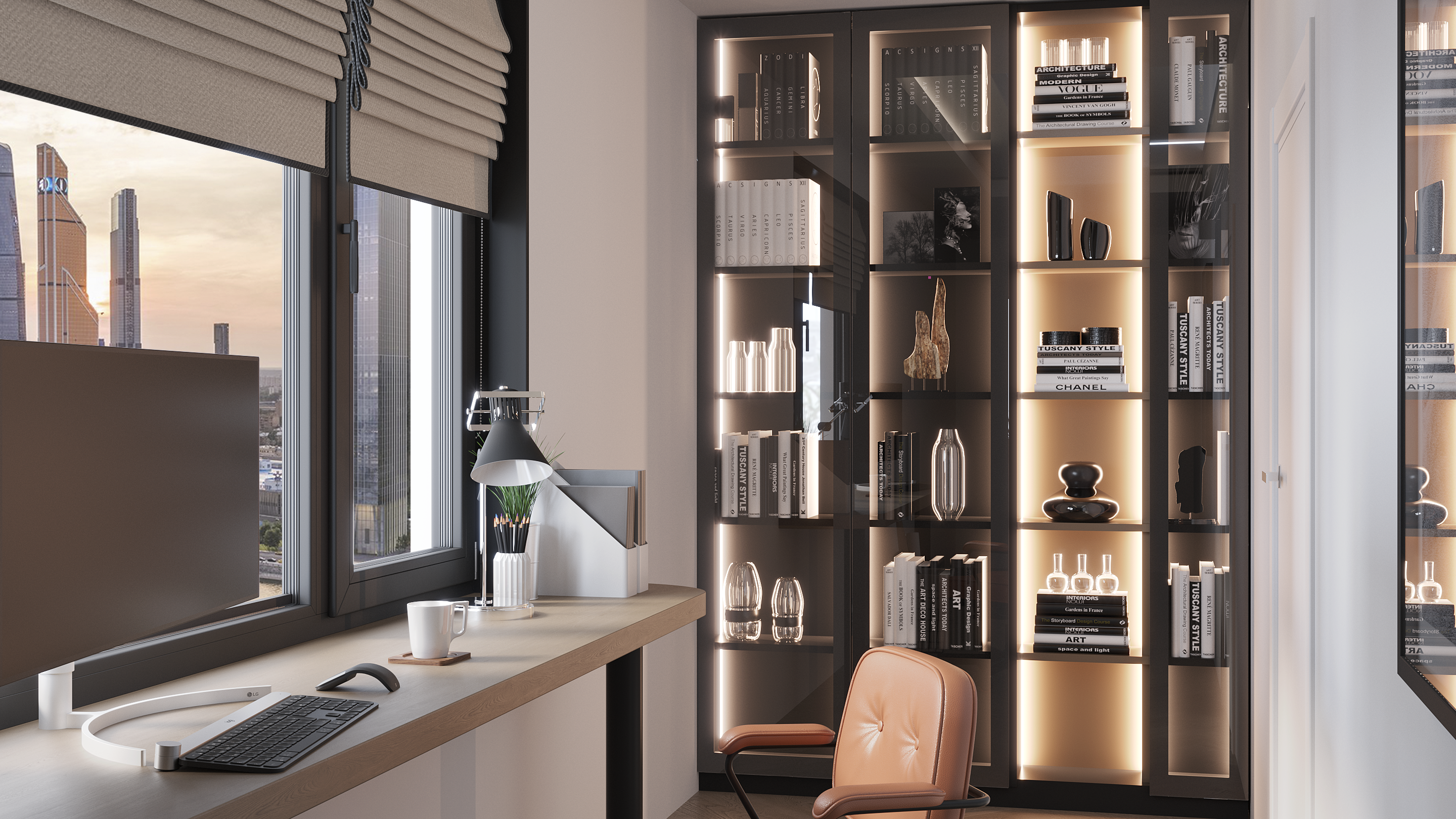 Стильный и практичный кабинет, сочетает в себе классику прямых линий и зеркальный блеск стеклянных витрин.