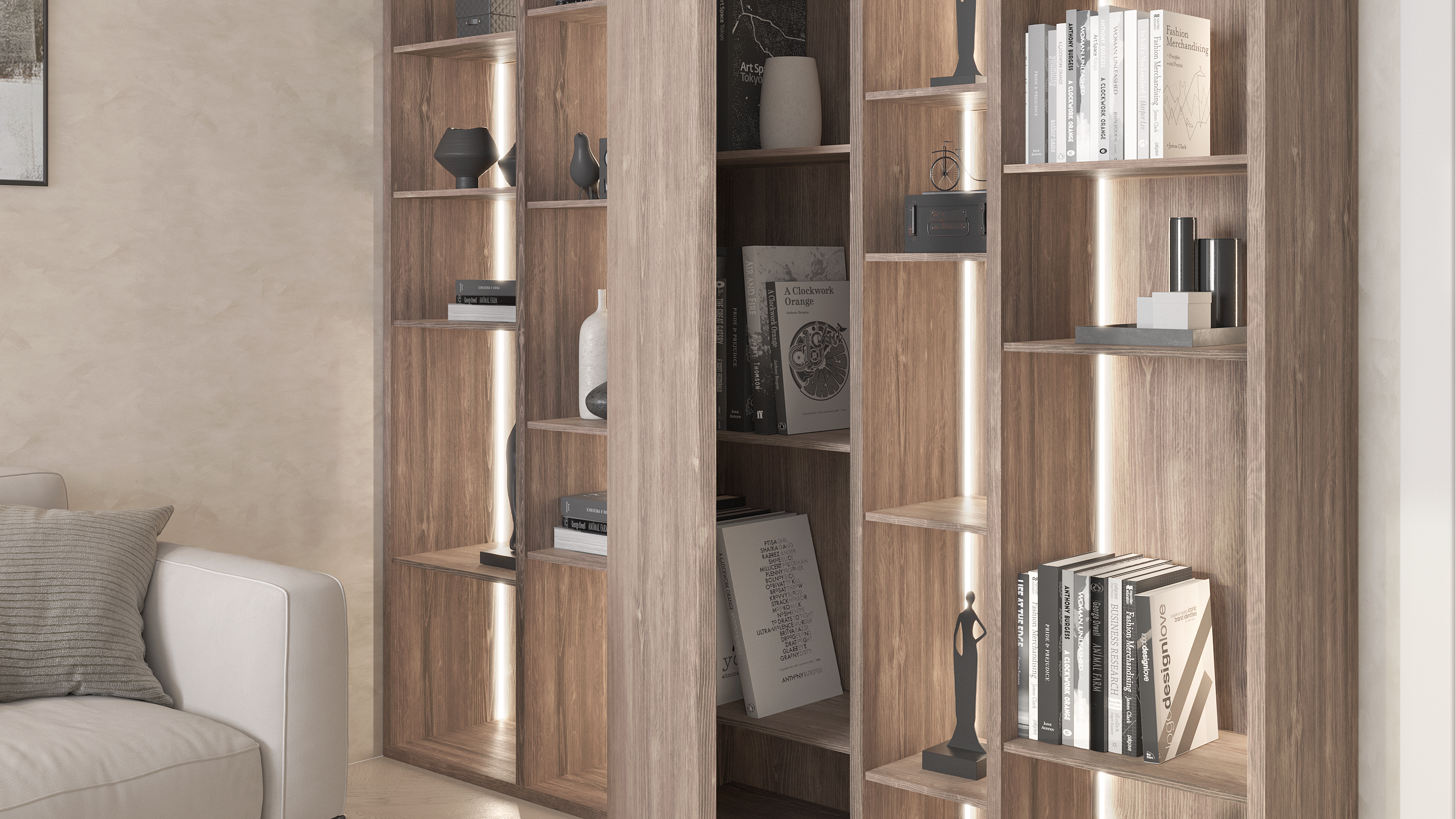 Фасады сделаны из МДФ толщиной 19 мм и отделаны натуральным шпоном различных пород деревьев, включая дуб, эбеновое дерево, палисандр, эвкалипт и многие другие.