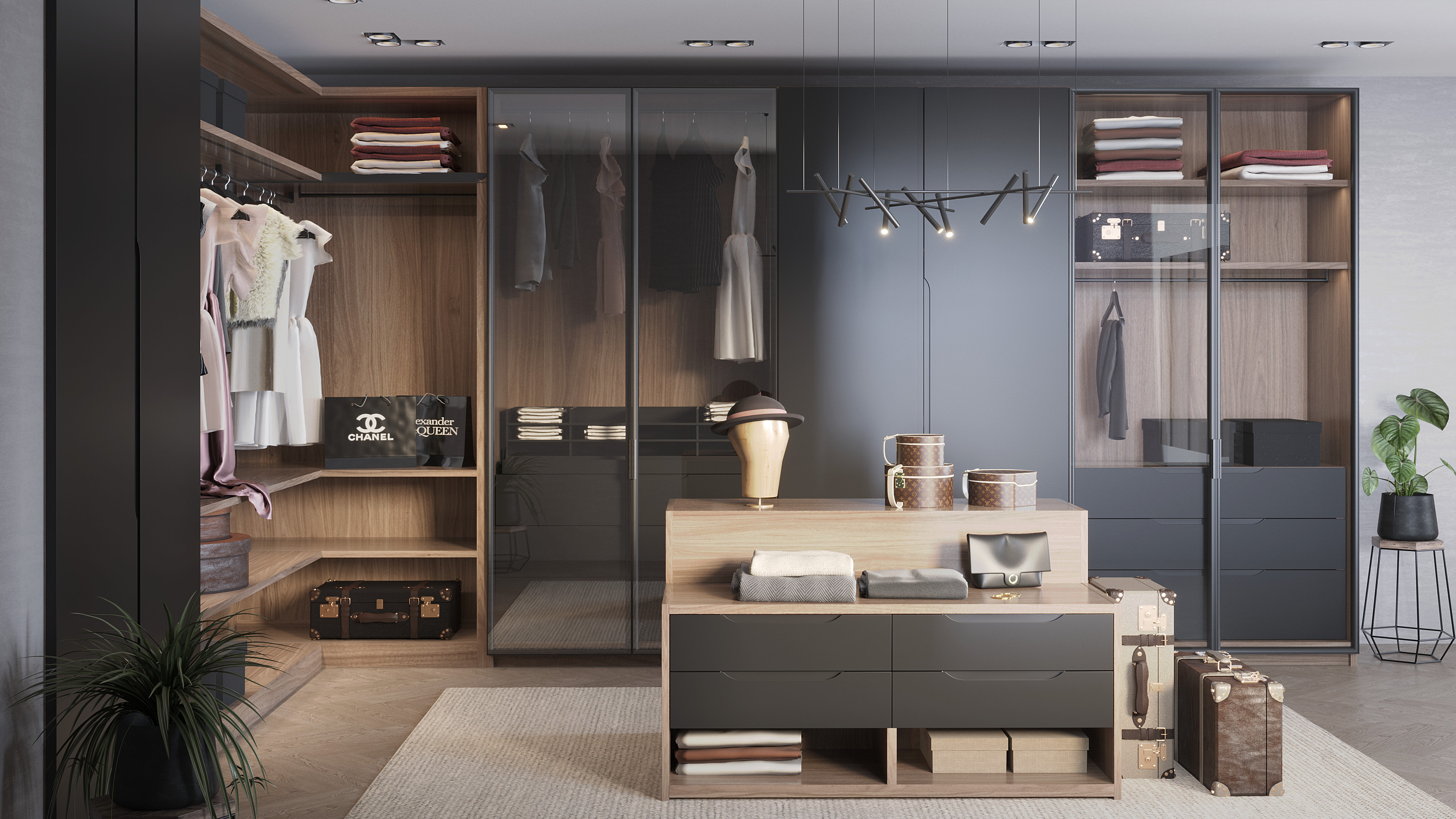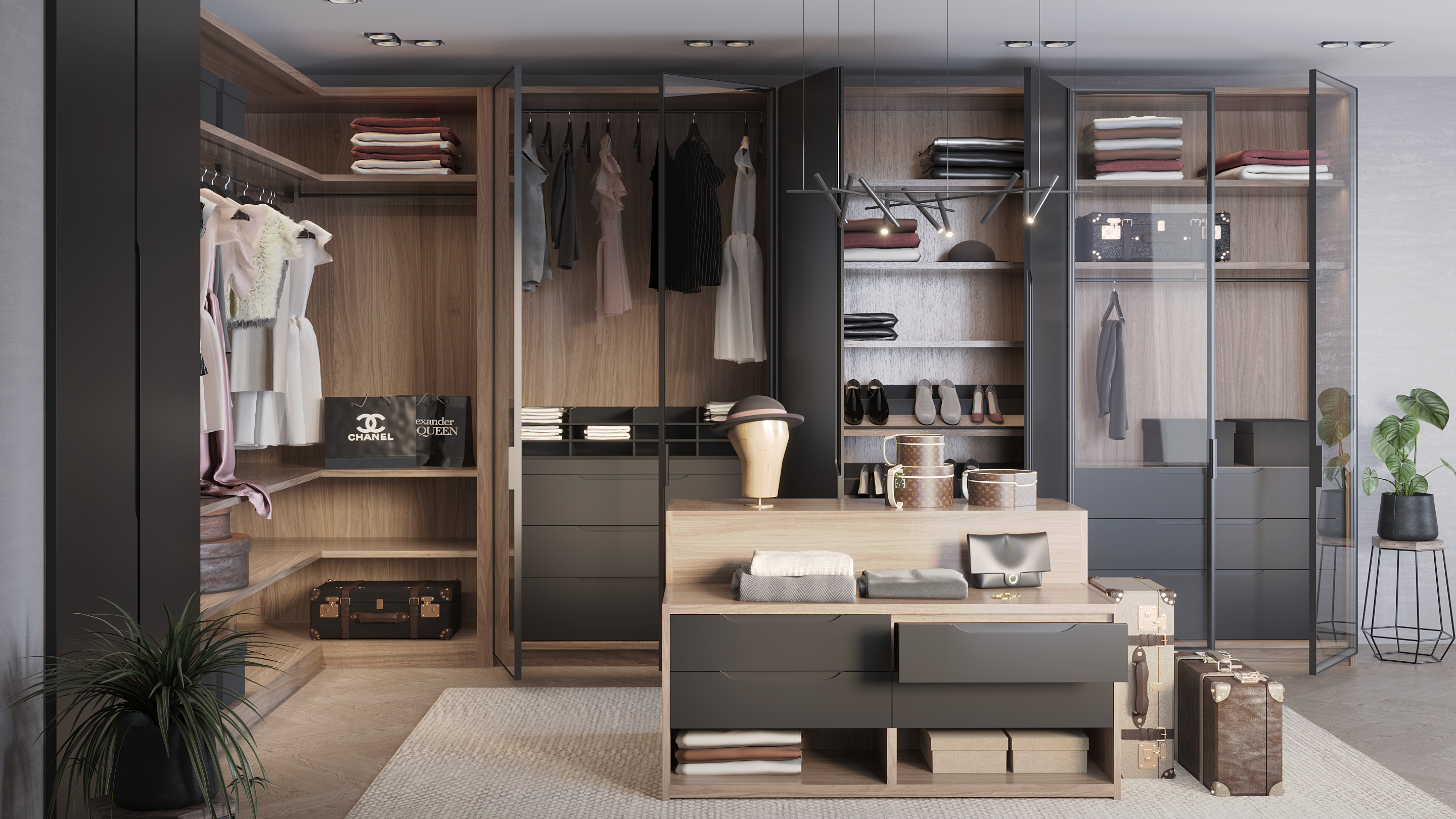 Также стоит обратить внимание на роскошные стеклянные витрины, обрамленные в черную алюминиевую рамку.