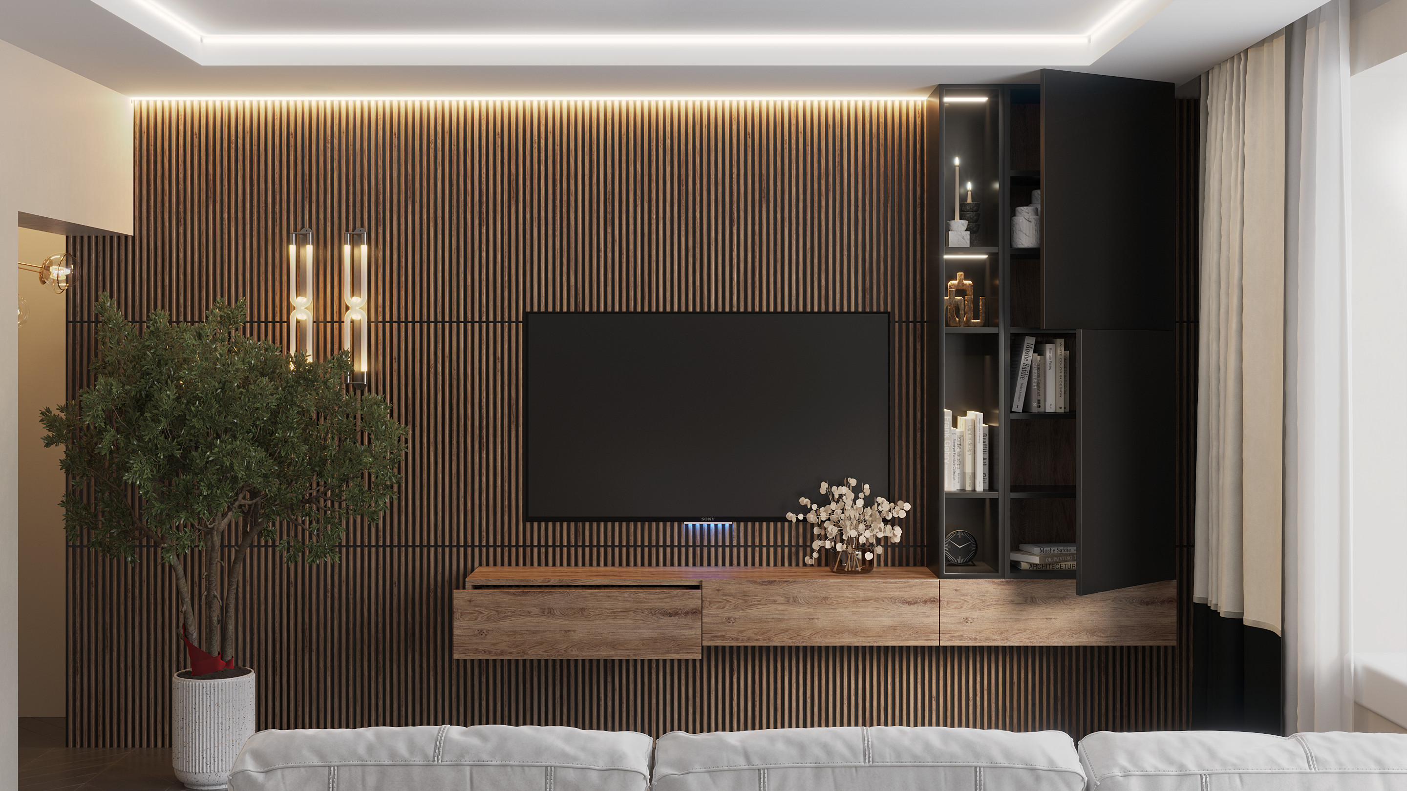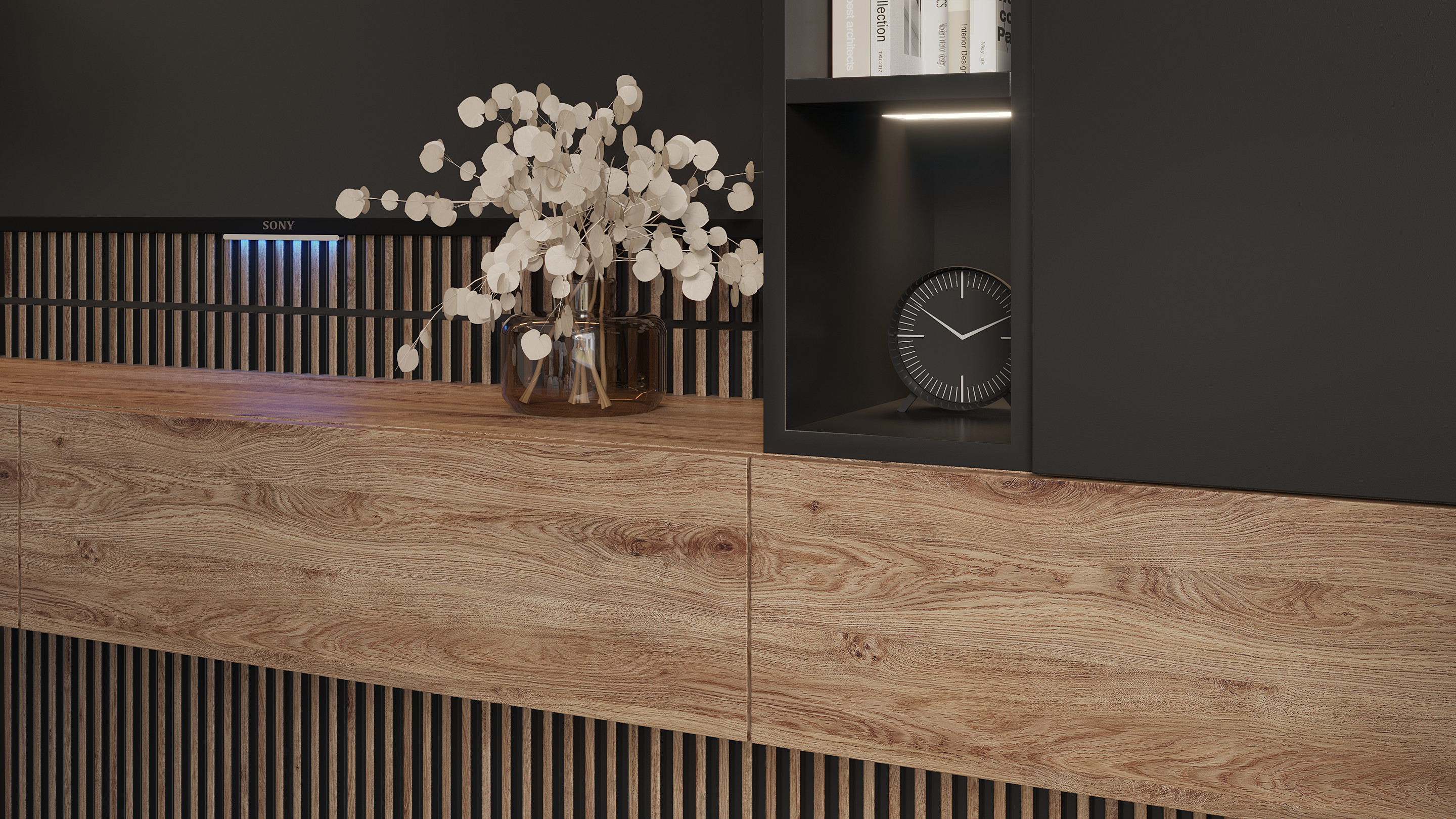 Модель гостиной Мила Плюс оснащена фасадами с эффектным 3Д дизайном. Они отличаются наличием шага между фрезерованными элементами, что придает поверхности фасада визуально объемный трехмерный узор.