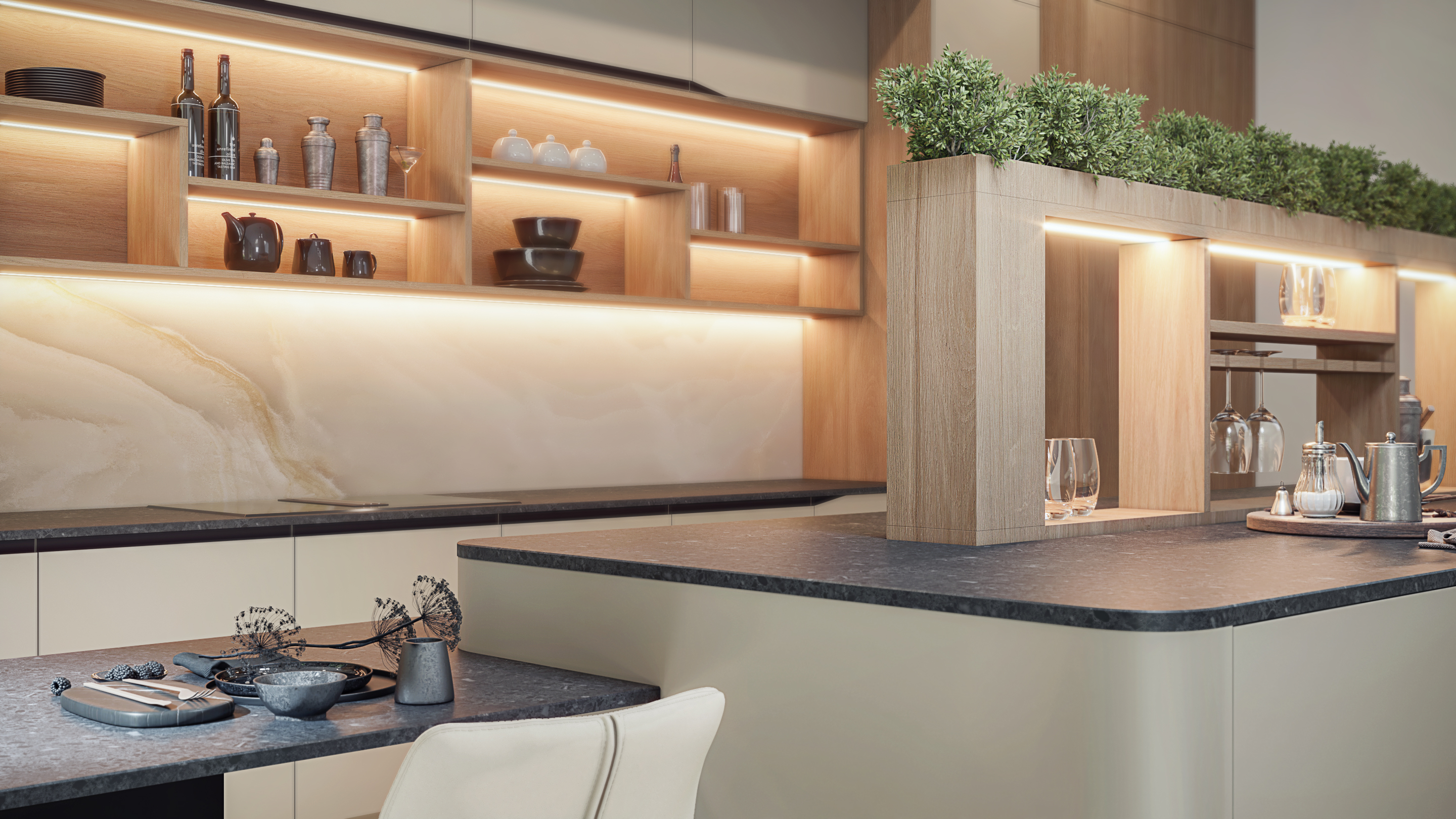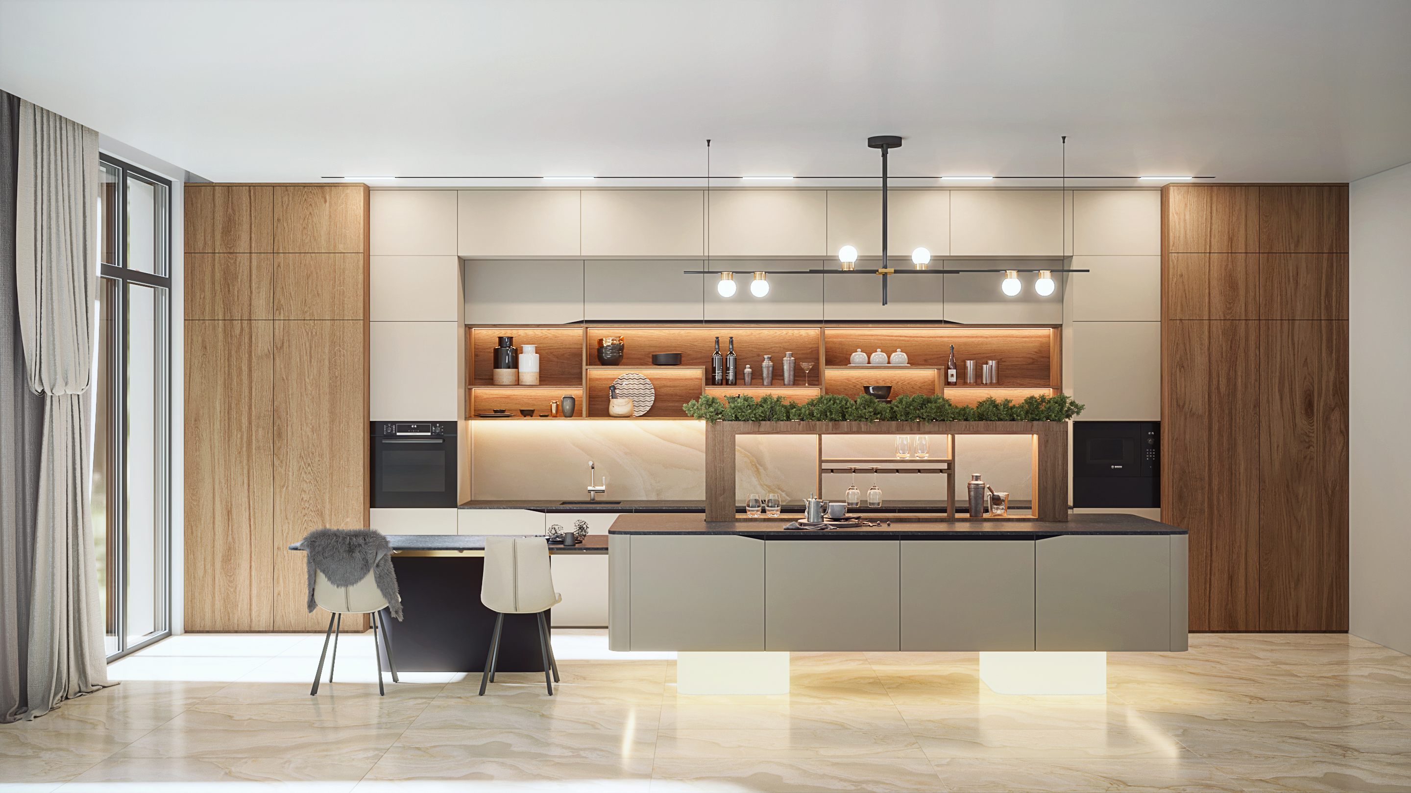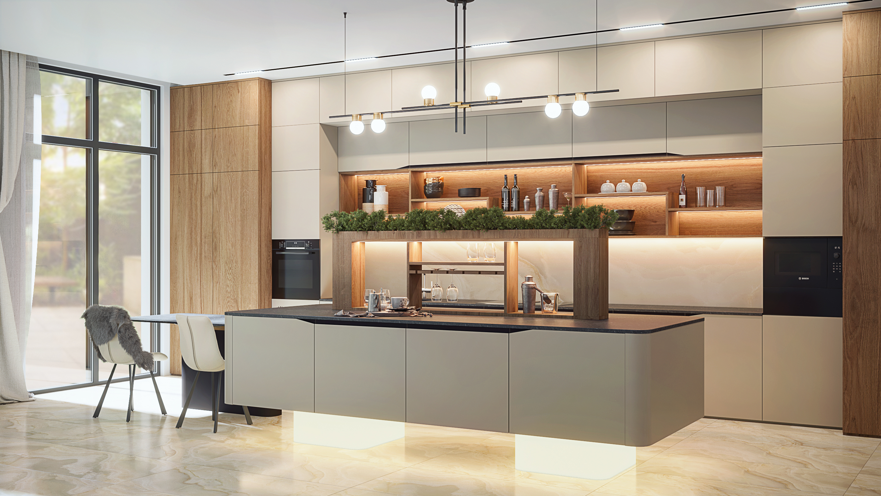 Остров выглядит невесомым, создавая ощущение простора и свободы. Отсутствие видимых опор делает его визуально легким и воздушным, а подсветка нижней части конструкции добавляет эстетики и подчеркивает необычную задумку дизайнеров.