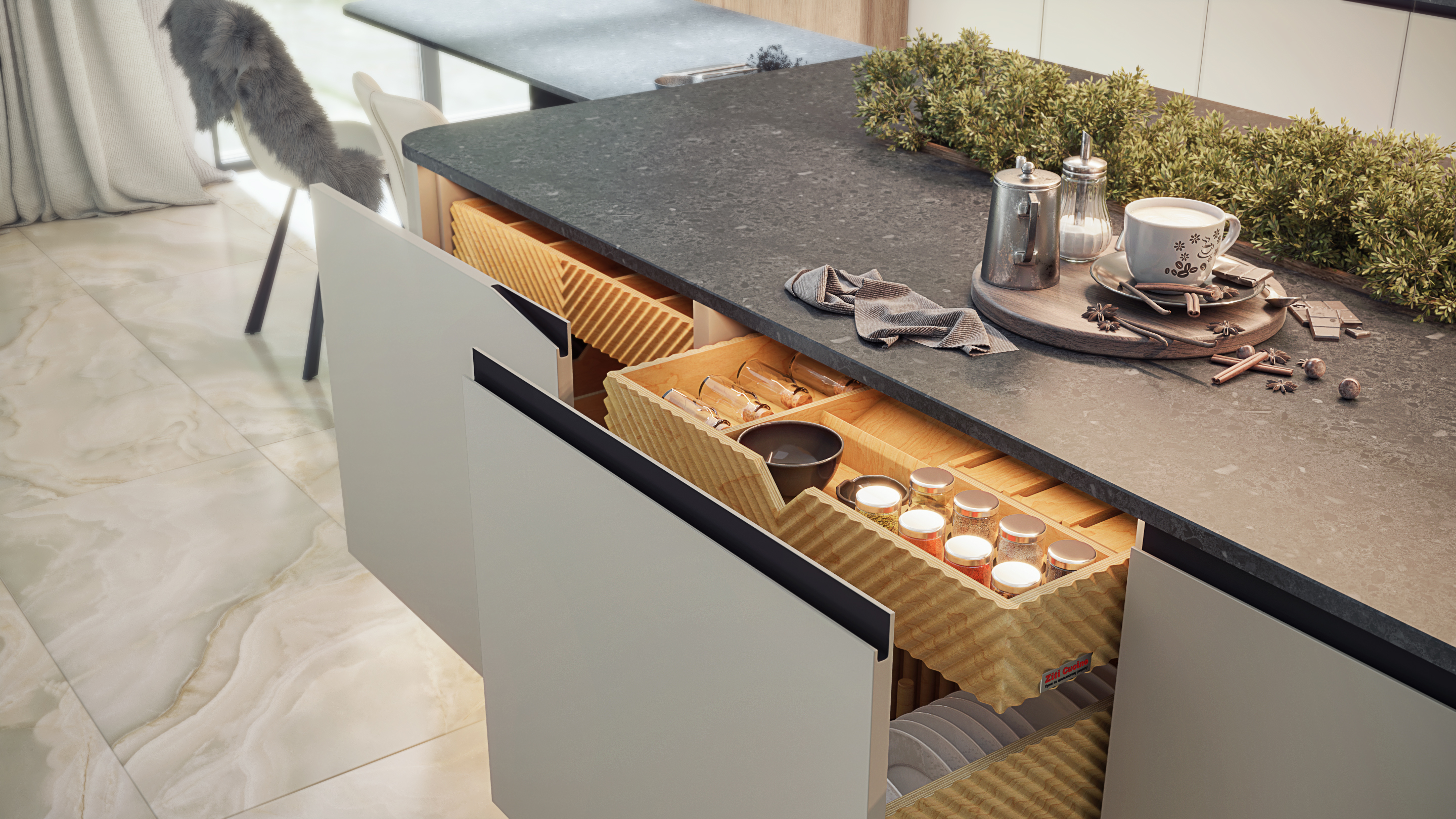 Еще одним акцентным элементом являются ручки, интегрированные в фасад, который получил название Анголо. Они создают изящные геометрические изгибы, визуально делая фасад более элегантным и сложносочиненным.