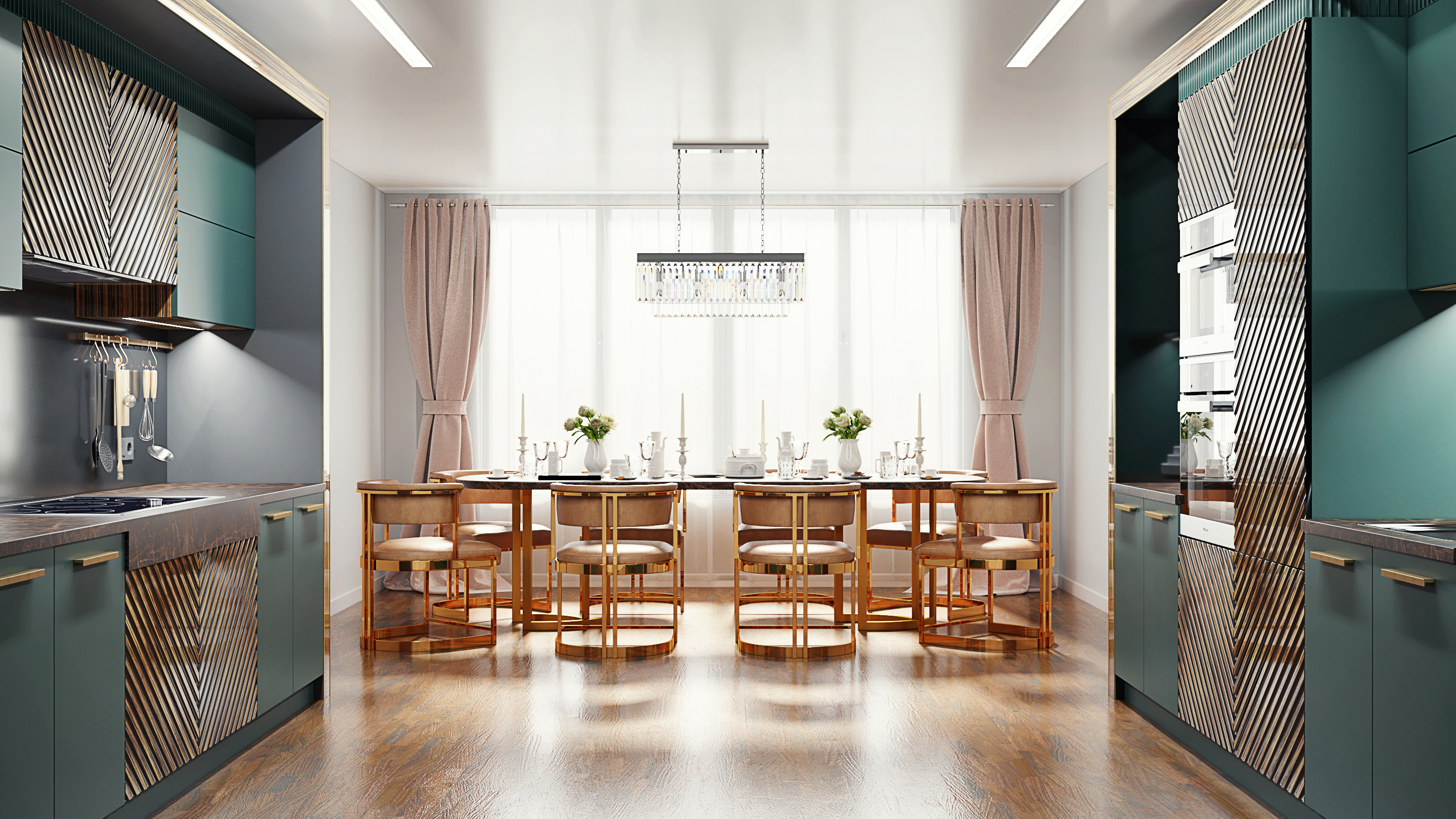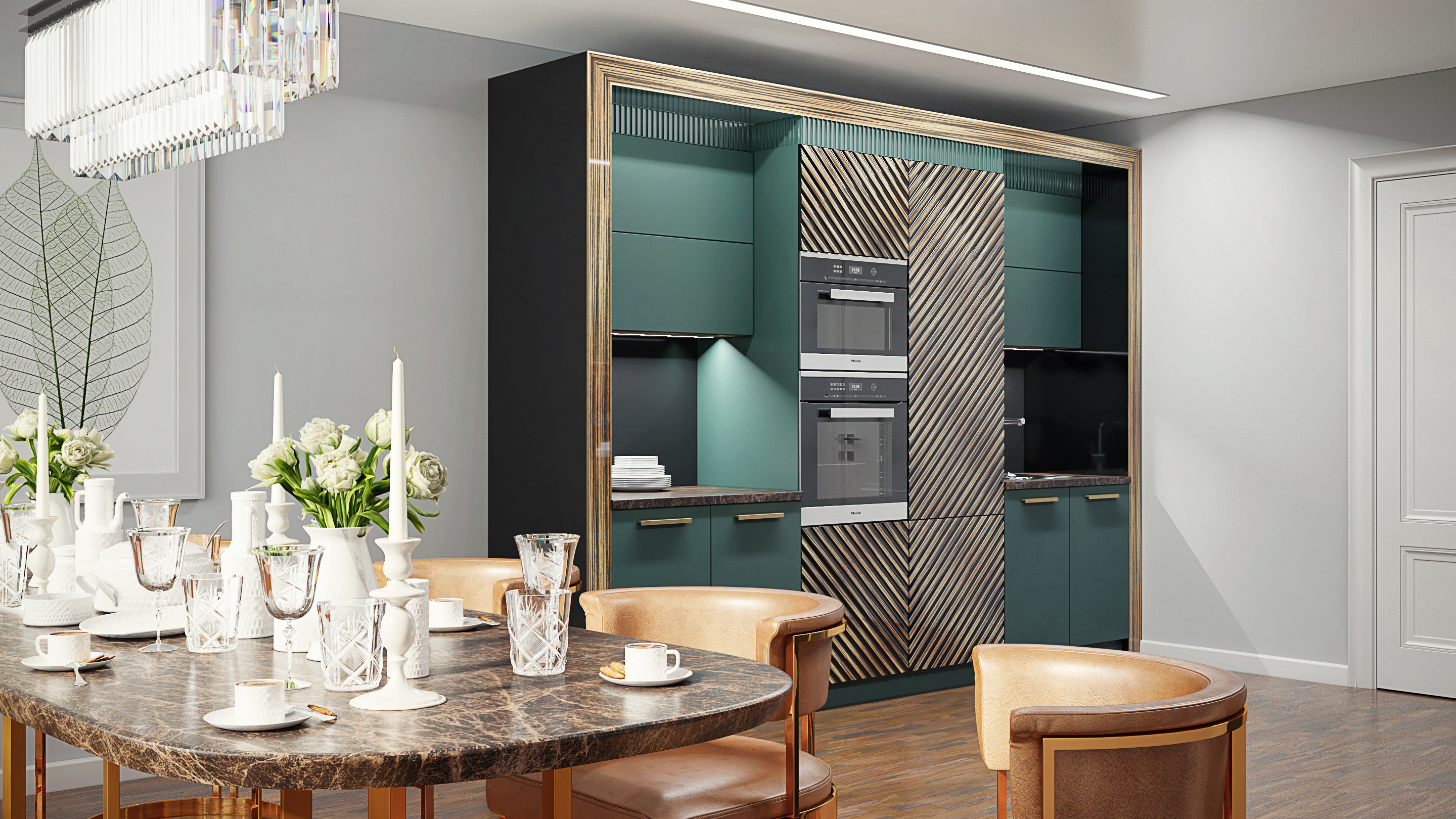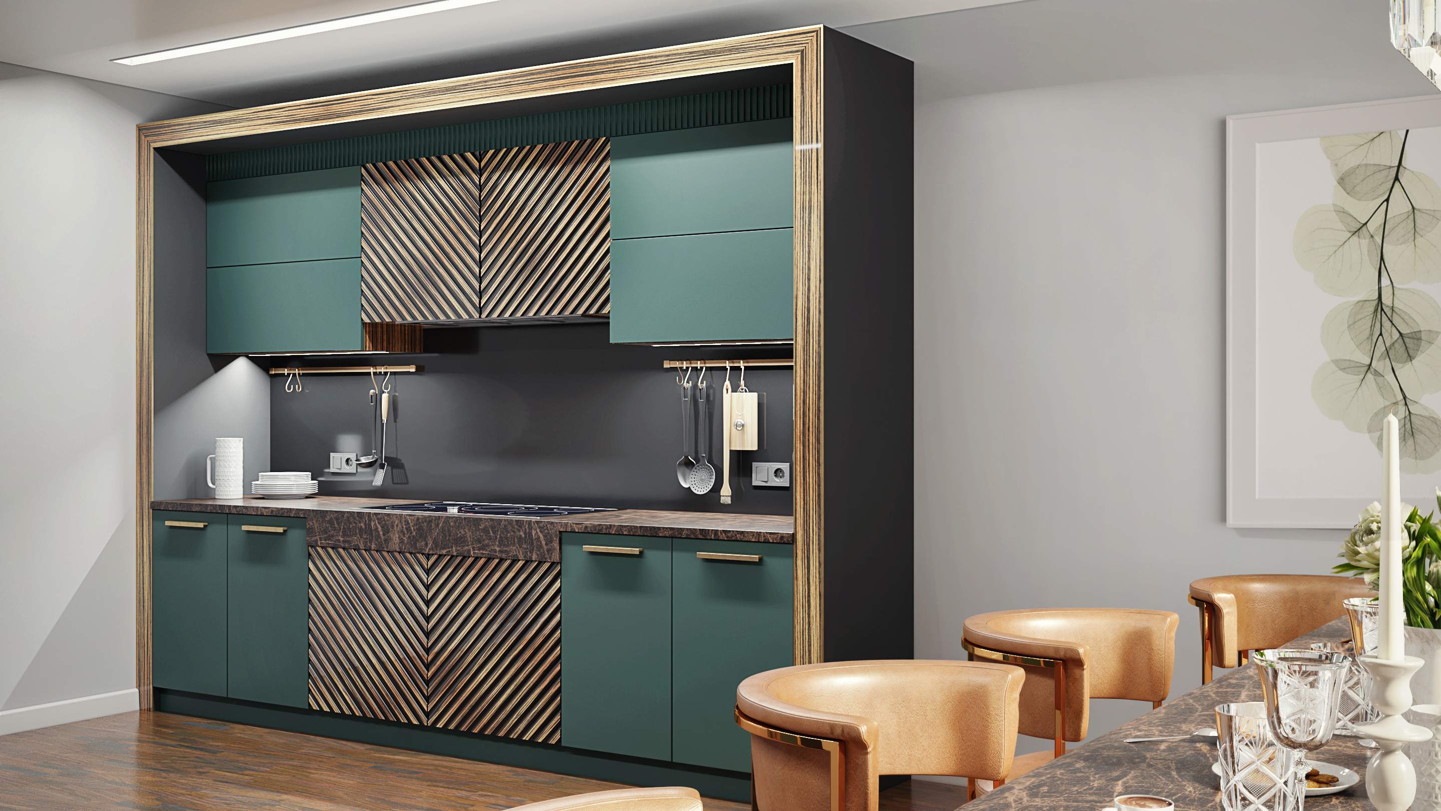 Модель Bergamo — отличный пример кухни, где можно сочетать несочетаемое. Гладкие полосы из натурального шпона дерева «зебрано» гармонично уживаются в ансамбле с фрезерованными вогнутыми глянцевыми полосами. Структура дерева придает пространству ощущение уюта, а вогнутые элементы прекрасно дополняют общую композицию.