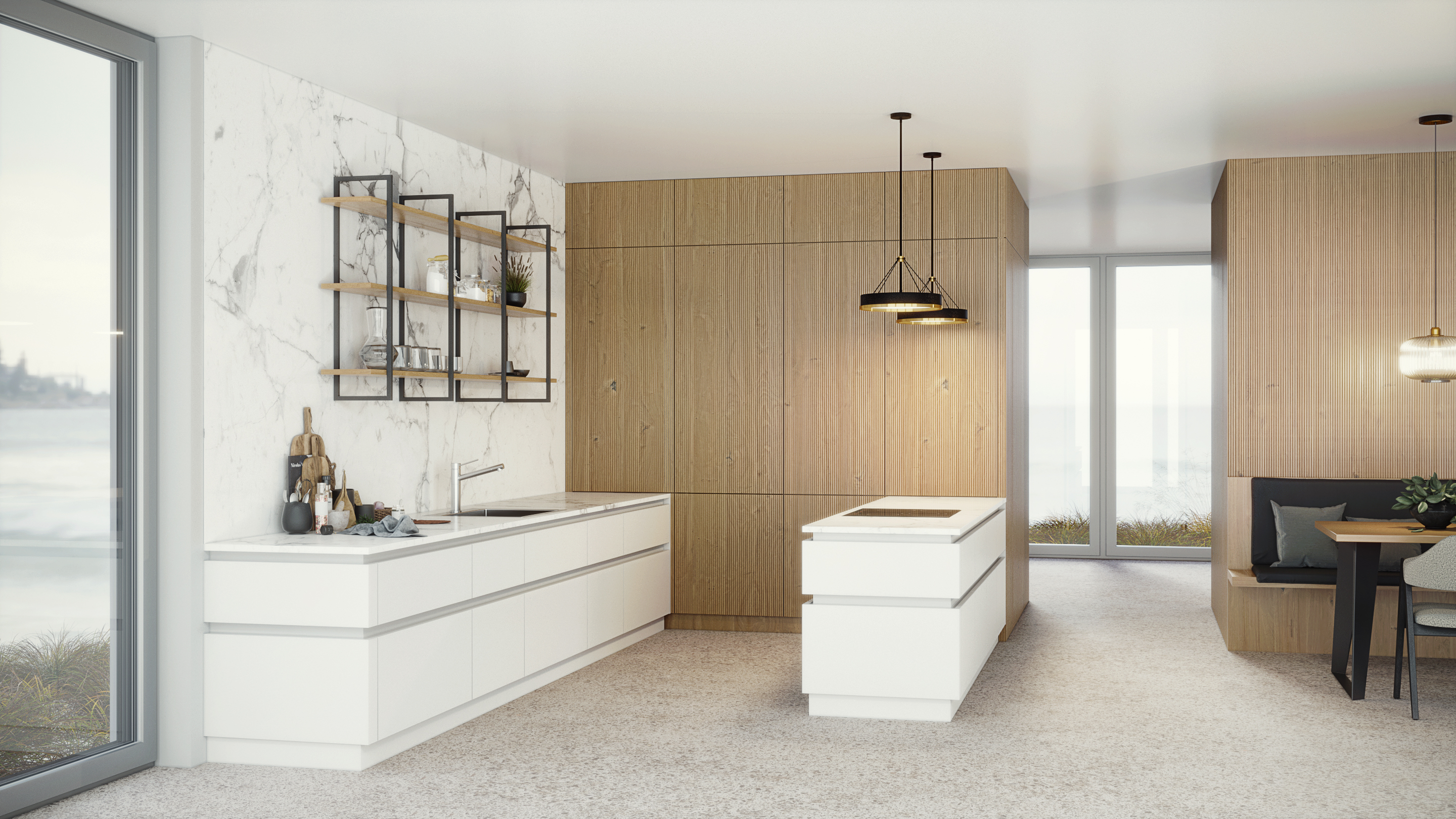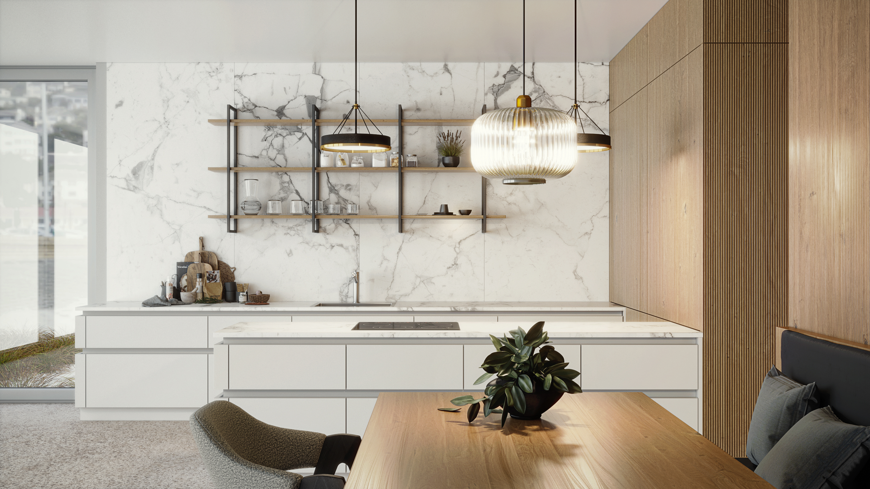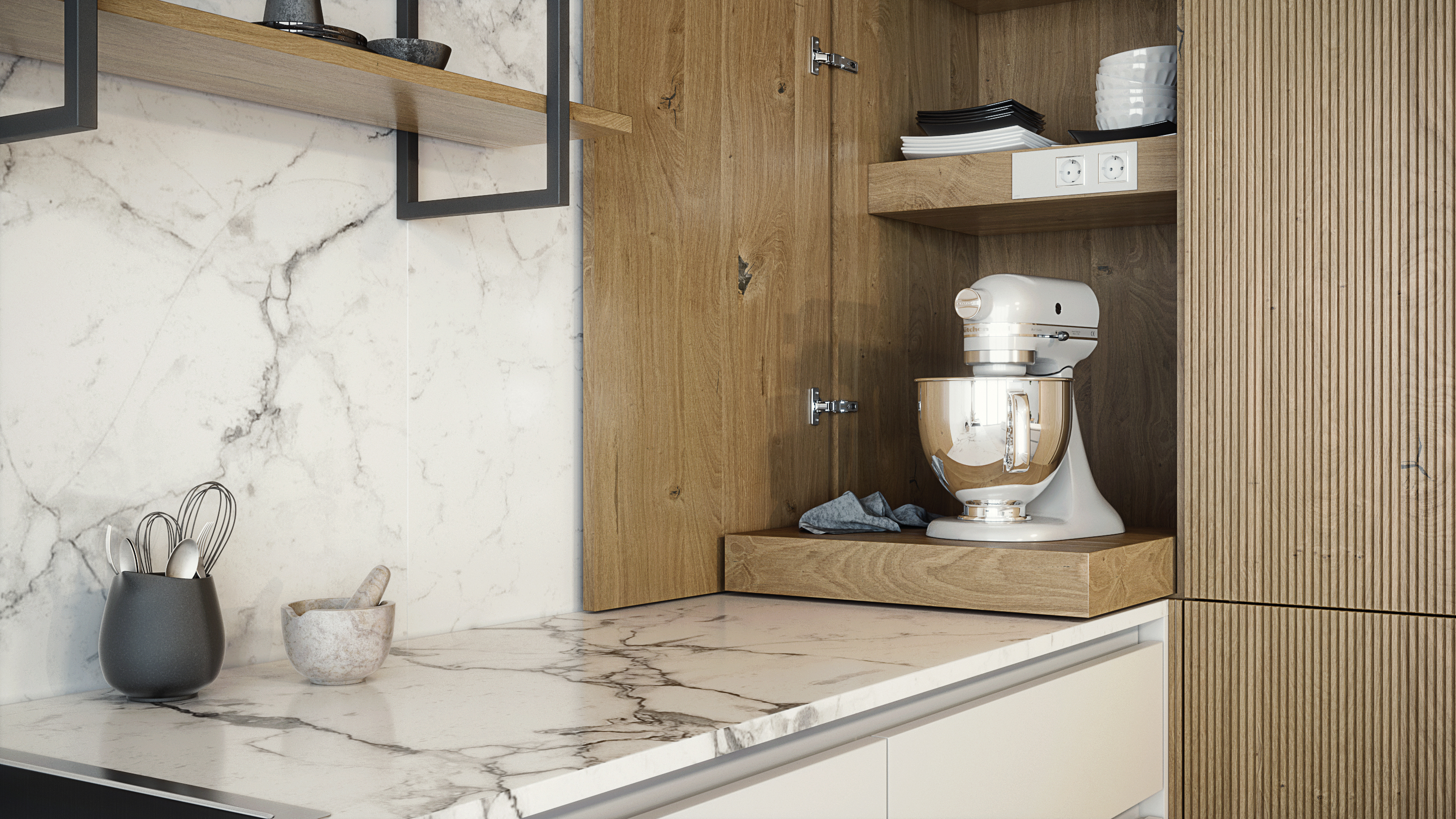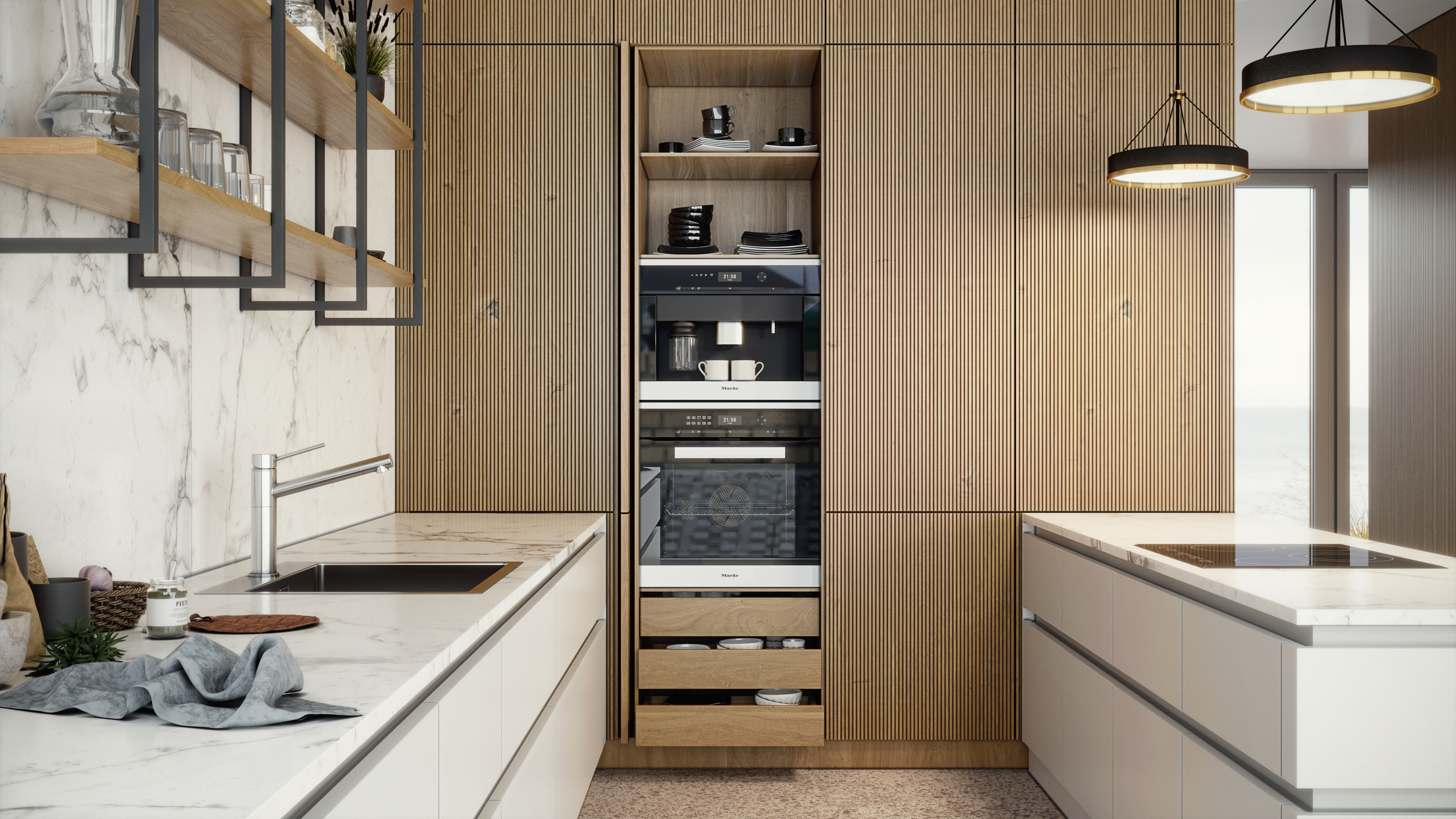 Открытые полки, встроенная бытовая техника, стильные матовые фасады в сочетании с рельефным шпоном создают уютный и функциональный интерьер на вашей кухне.