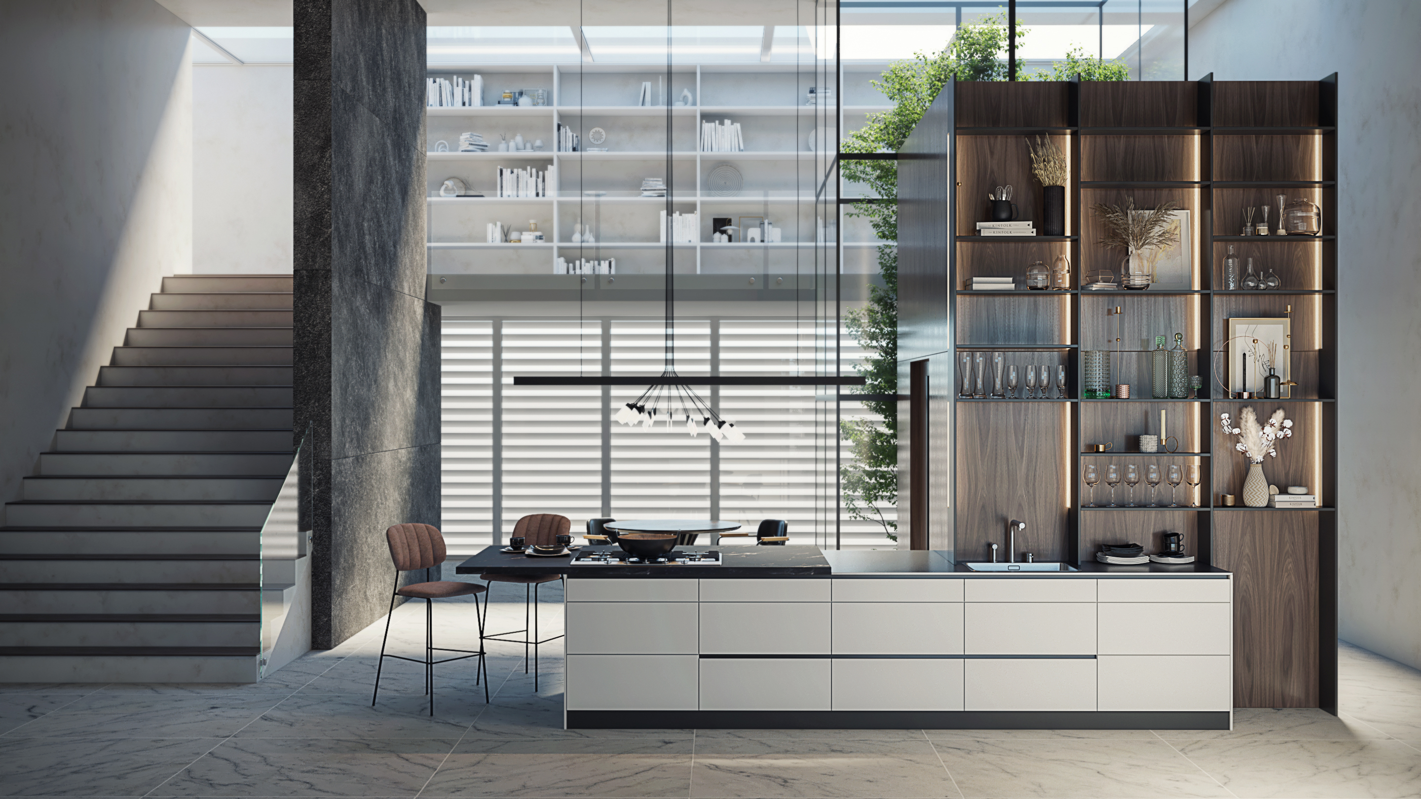 Светлые поверхности удачно контрастируют с открытыми полками и темной фактурой дерева, создавая интерьер в стиле "тихая роскошь".