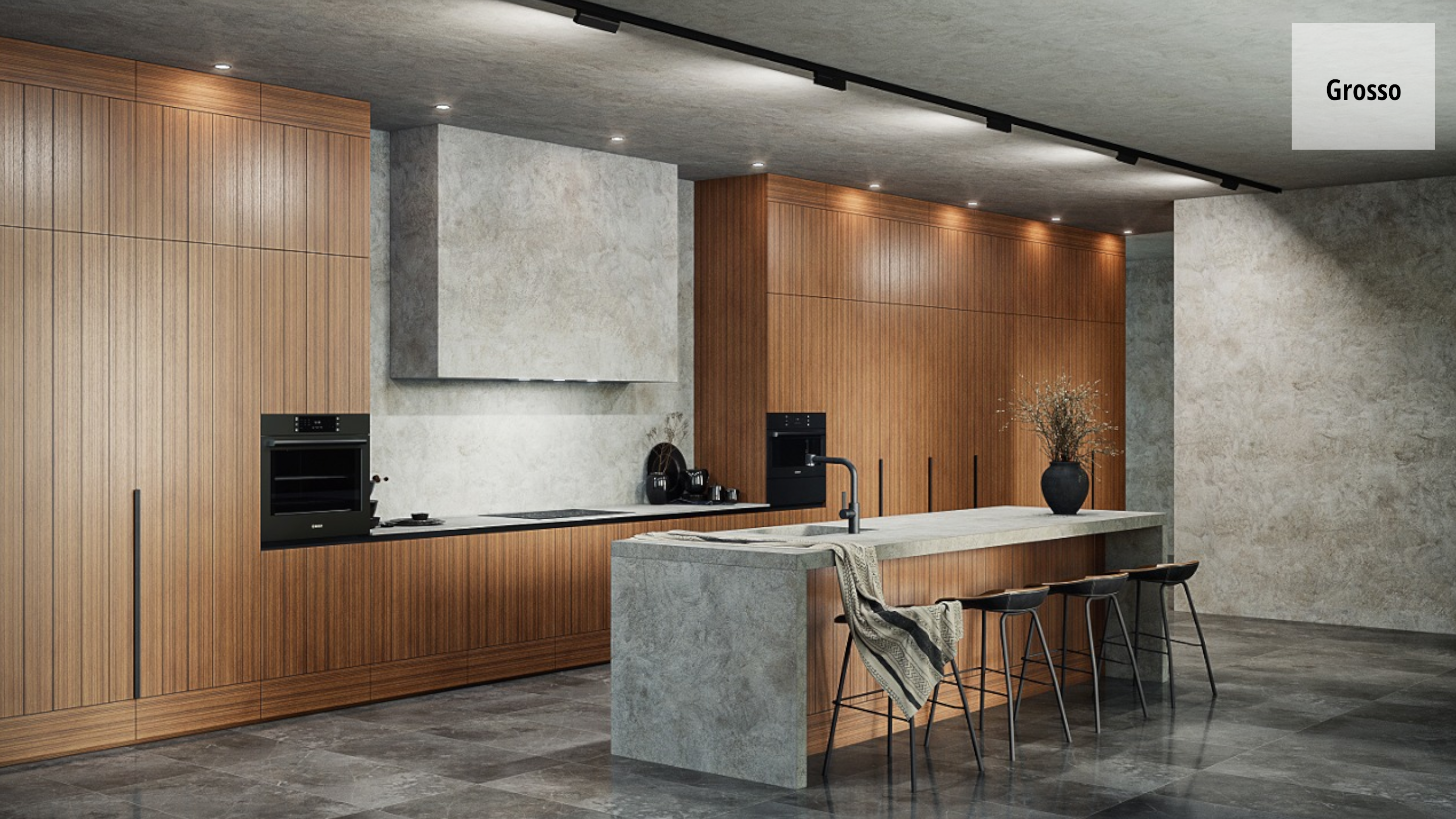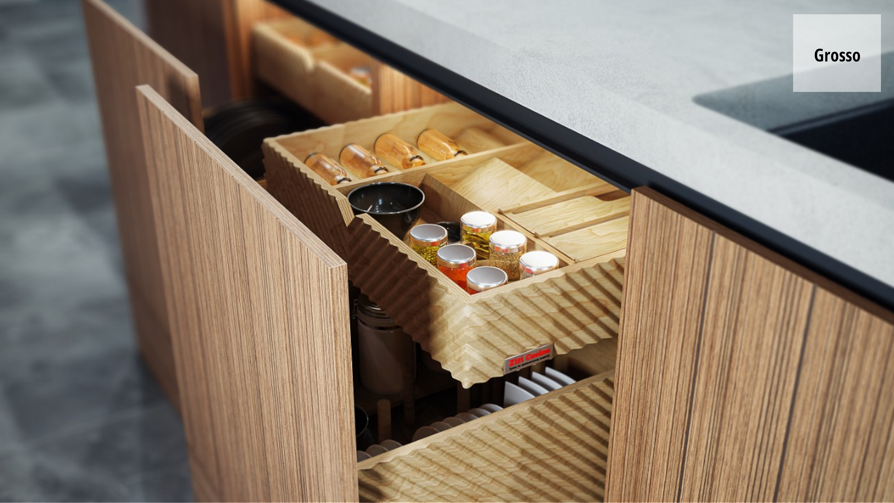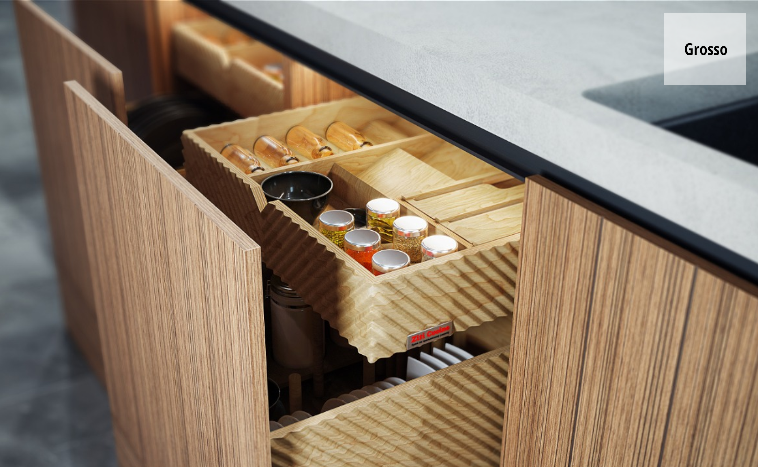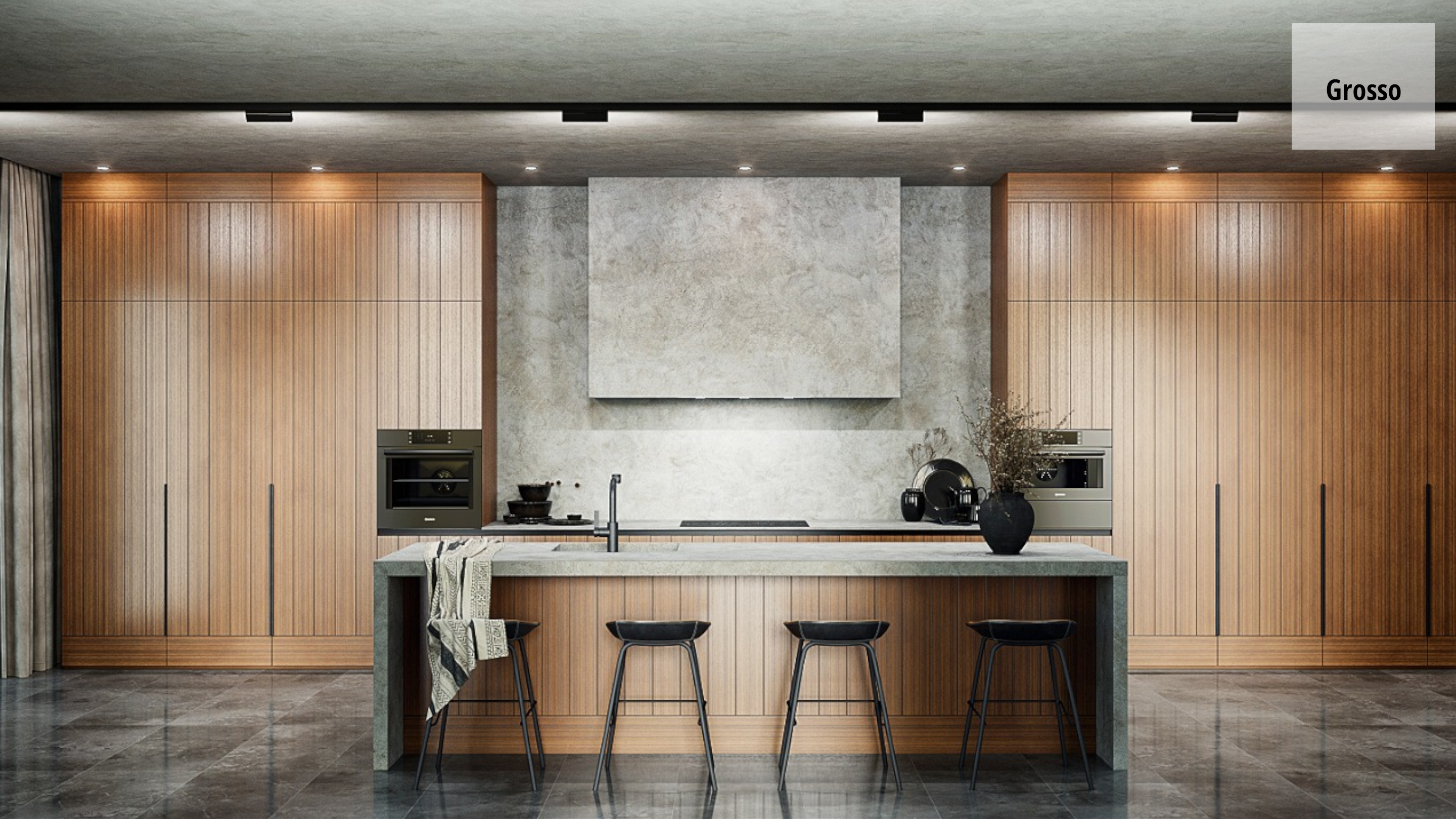 В данной модели мы сочетаем шпонированные из дуба фасады в теплом оттенке и "холодный" массивный серый камень, тем самым создавая контраст текстур и цвета.