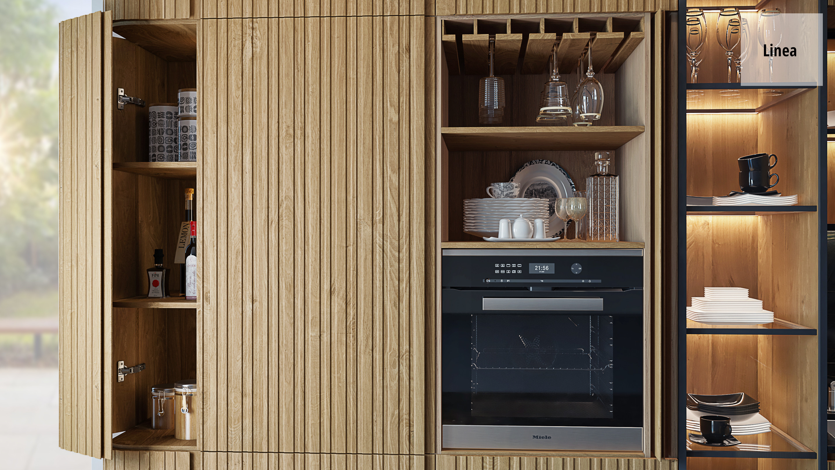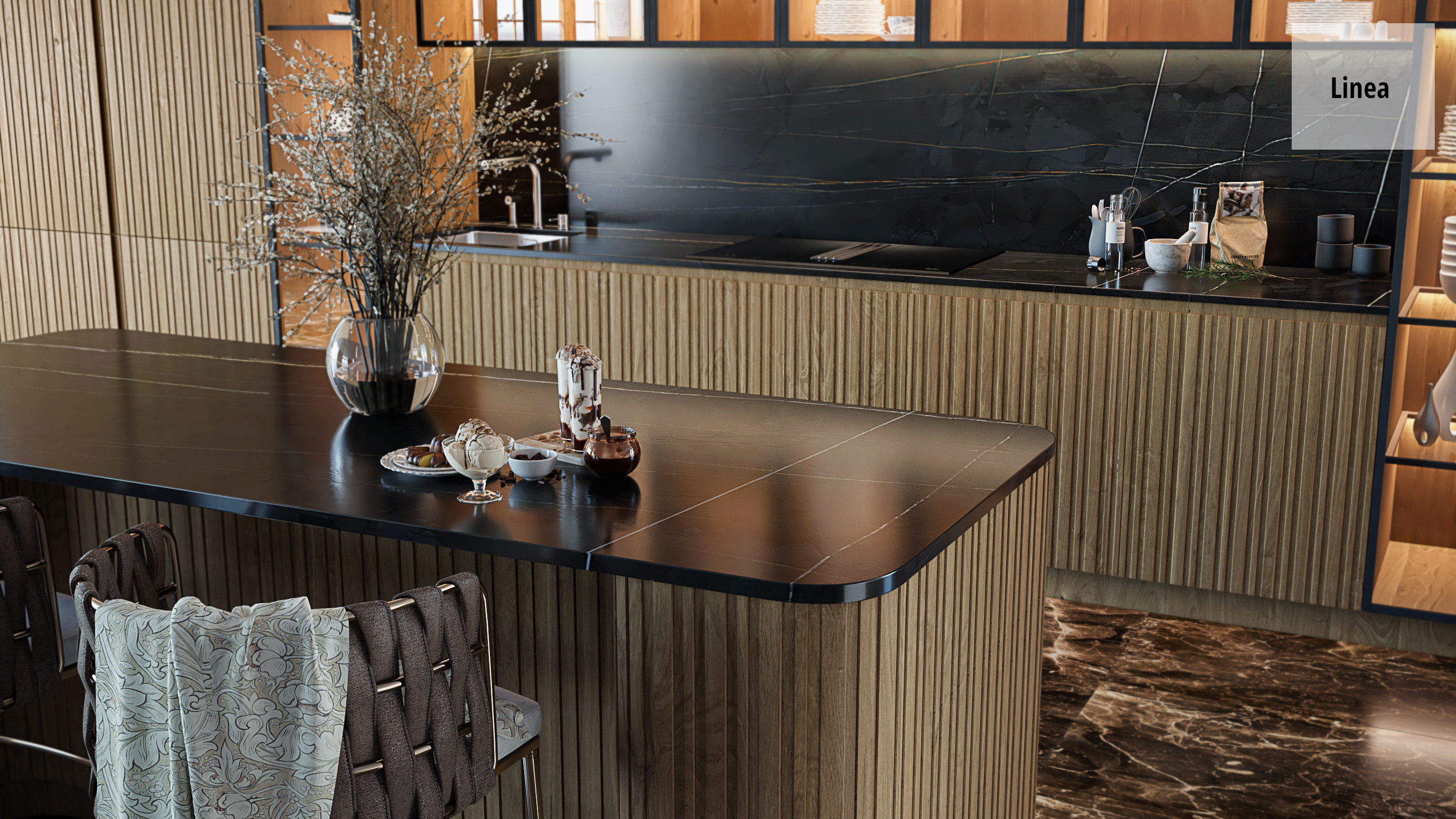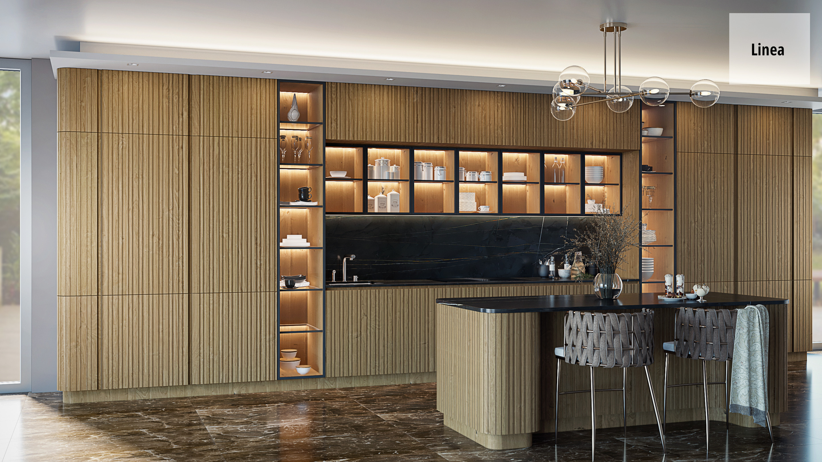 В модели Linea рельефные фасады умело сочетаются с натуральным камнем, деревом, металлом и стеклом, создавая стильное и неповторимое интерьерное решение.