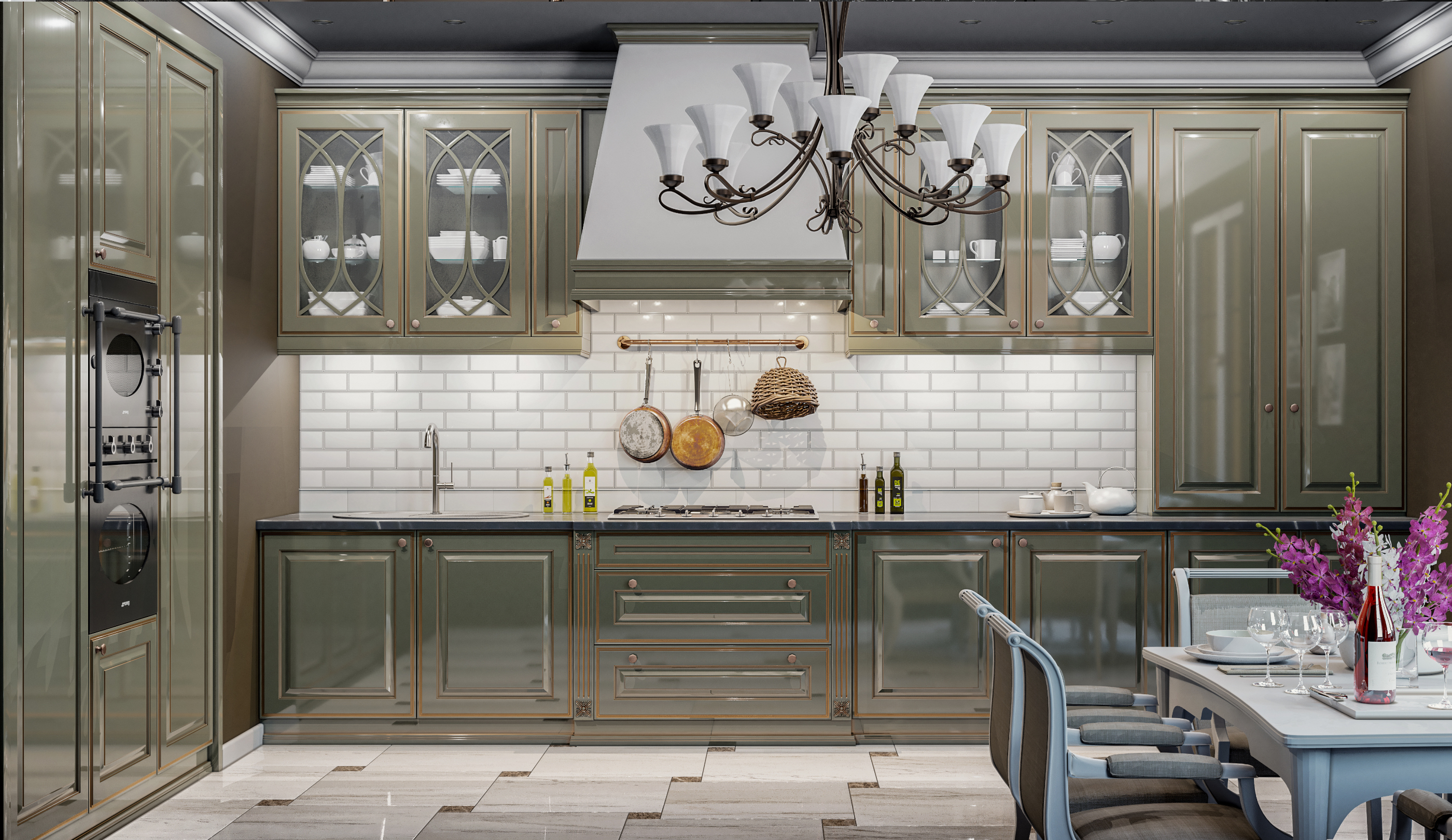 Патина золотого, бронзового или серебряного цвета наносится на каждый элемент вручную, что придает изделию абсолютную неповторимость. Это одна из немногих классических моделей кухонь, для которой возможно глянцевое покрытие по уникальной запатентованной технологии «Mirror Gloss» (зеркальный глянец).