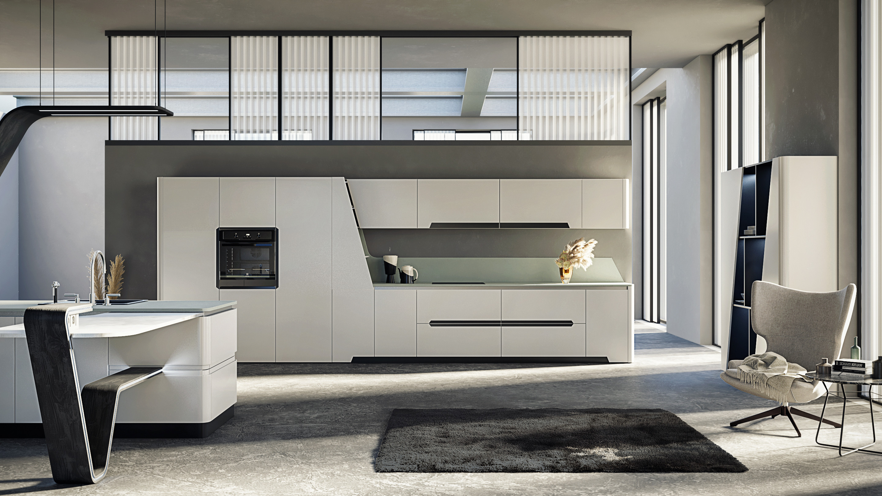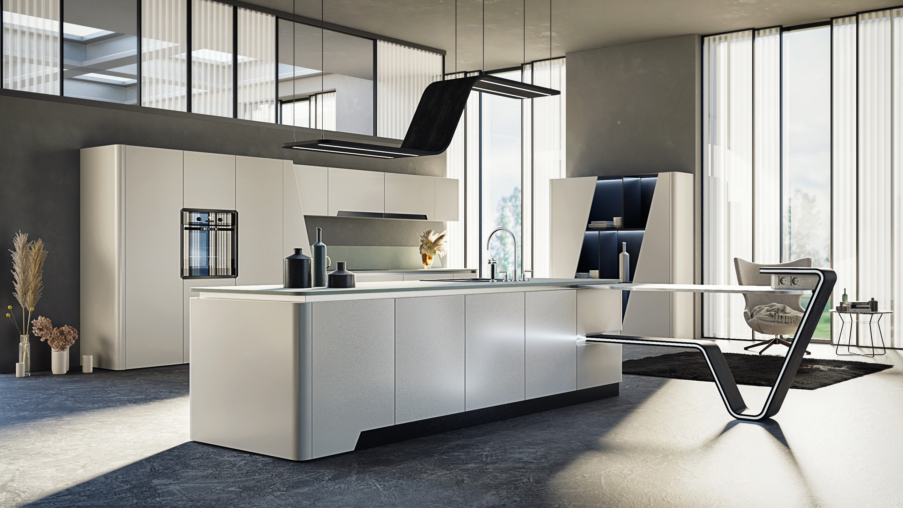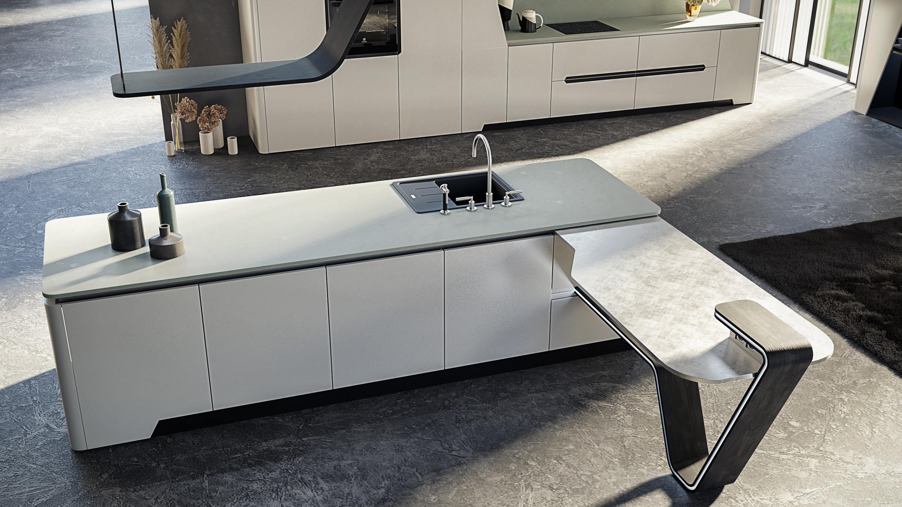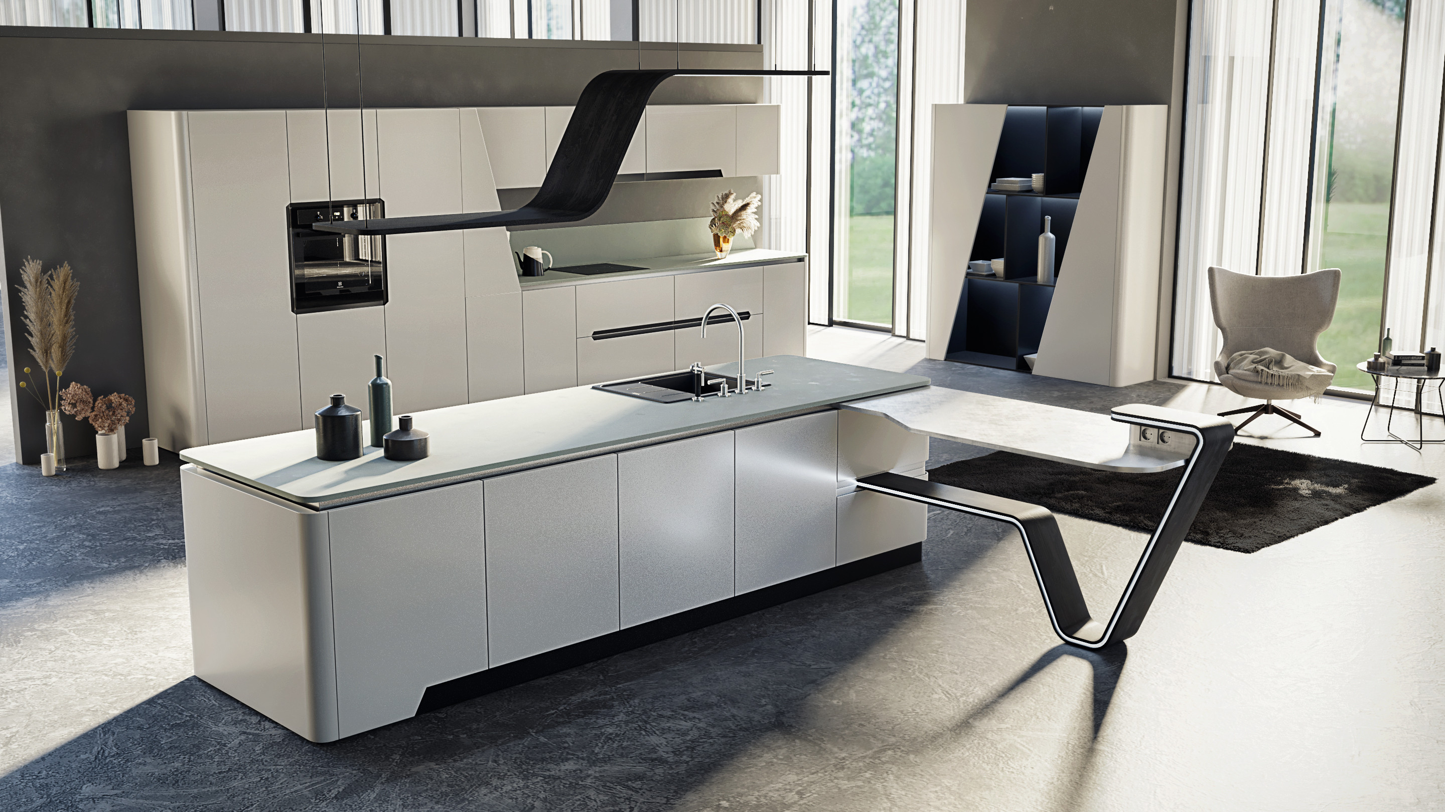 Главный из них – приставной стол с интегрированной подсветкой, изготовленный из гнутоклееного дуба. Стол может быть установлен как вдоль оси острова, так и перпендикулярно к нему.