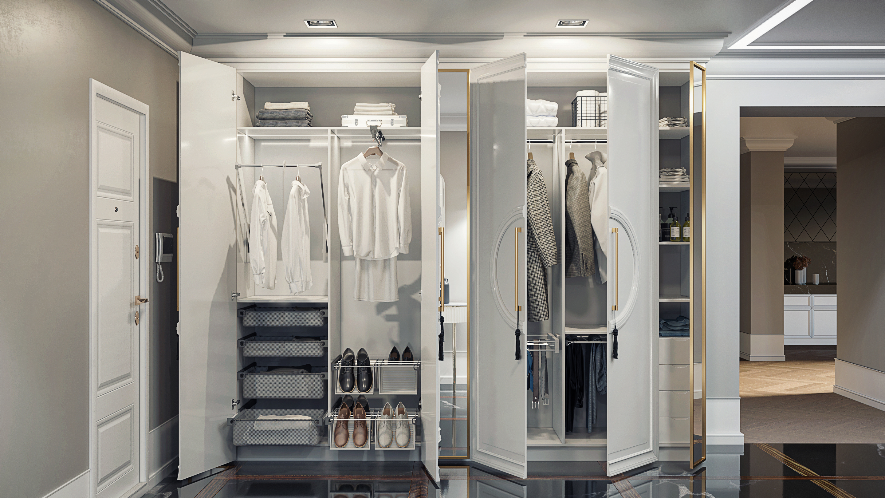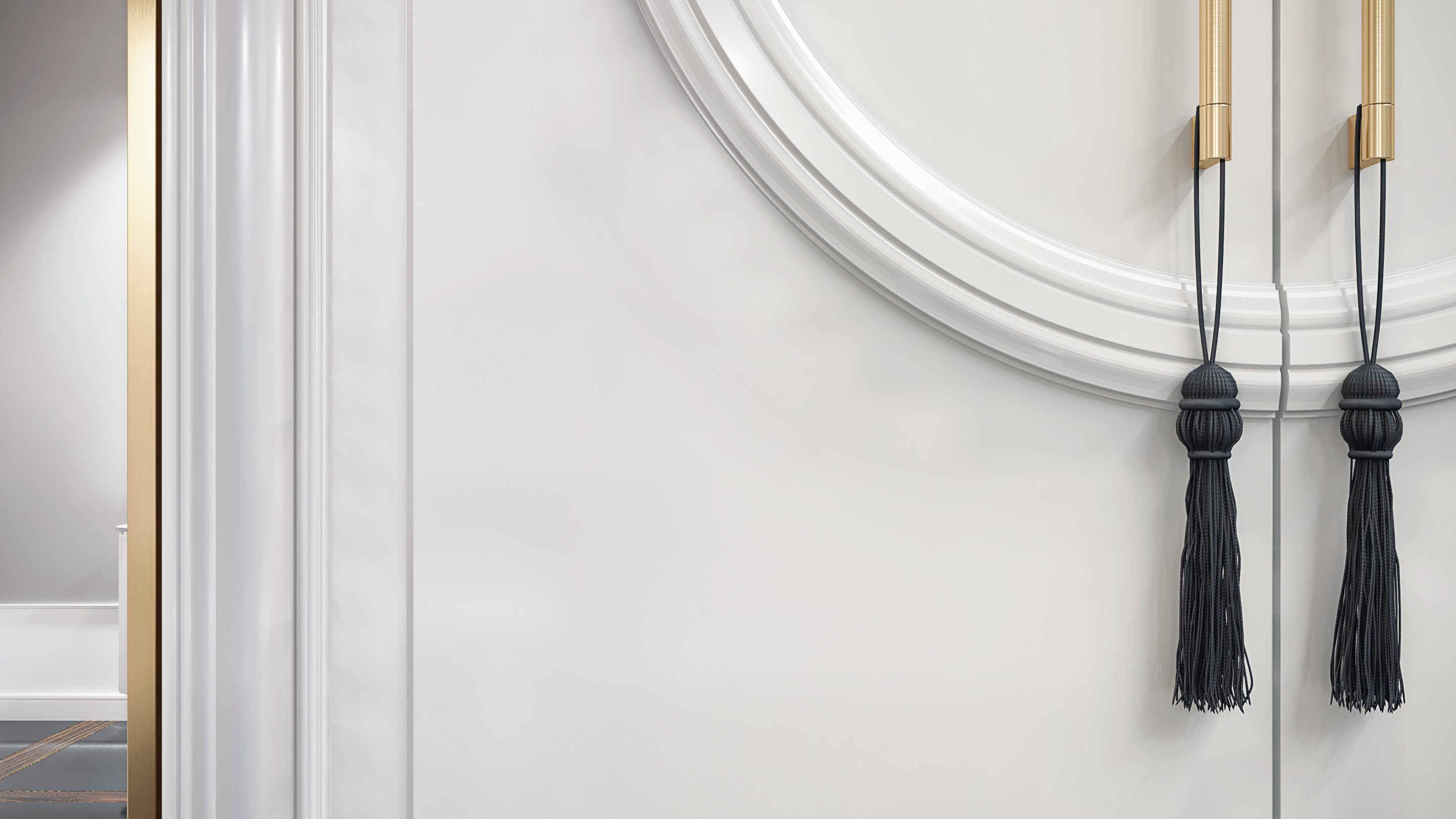 Шкаф Уника — это воплощение элегантности и аристократичного вкуса. Глянцевые фасады, обрамлёнными золотистым контуром, сочетают классические формы с современной роскошью. Центральные круглые элементы с элегантными кистями придают шкафу изысканный вид.