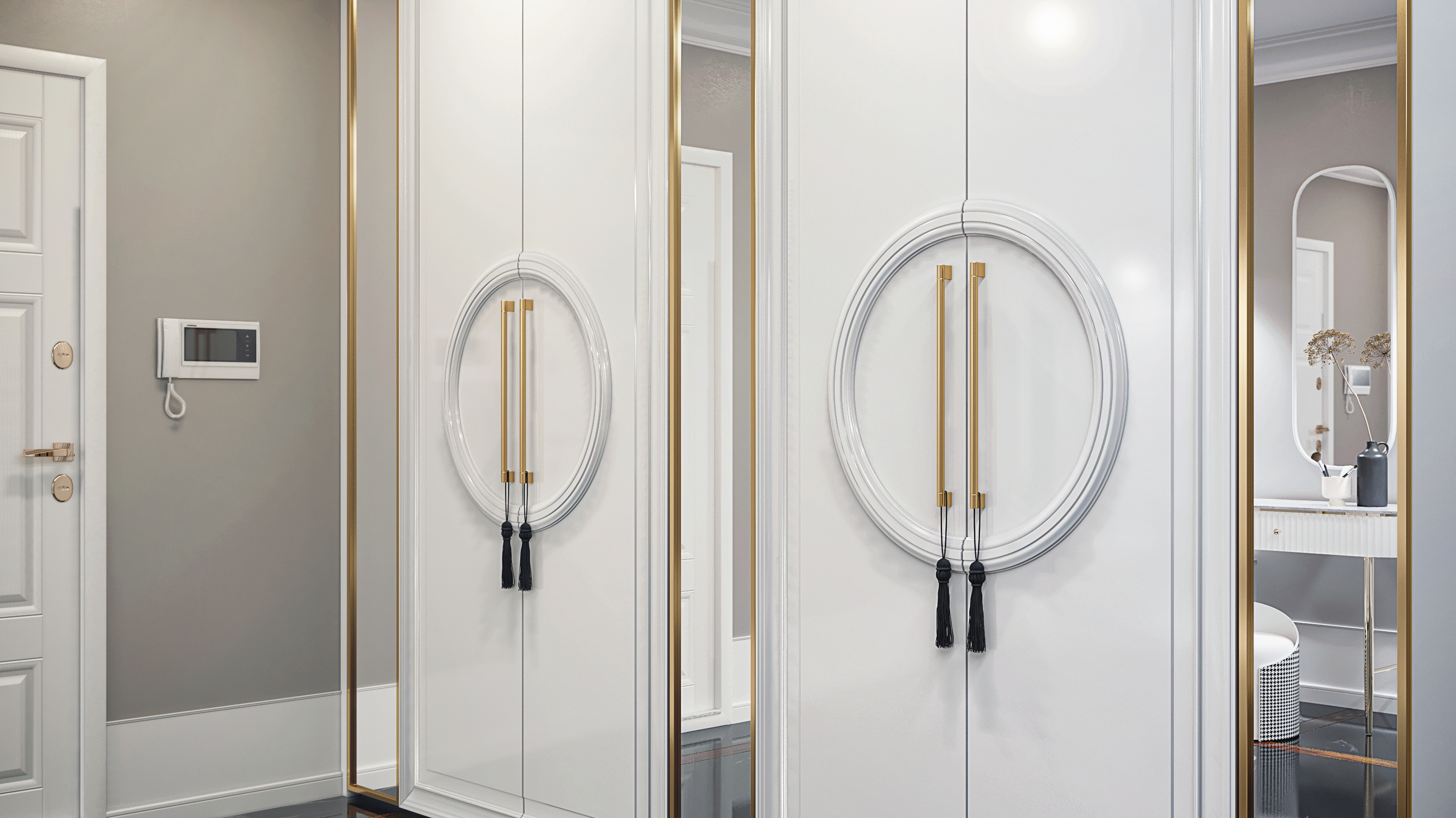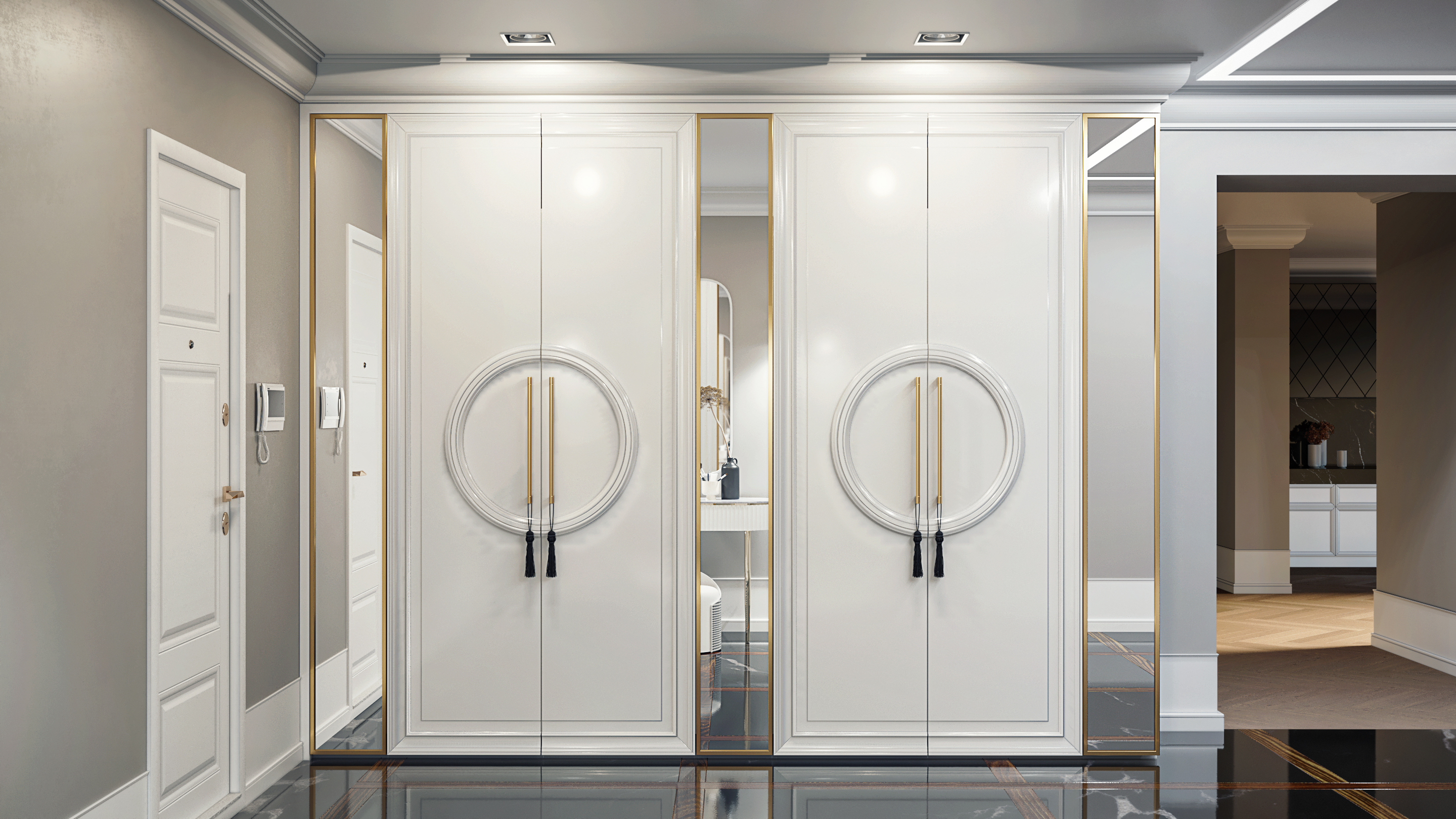 Зеркальные элементы по бокам визуально расширяют пространство, делая его более объемным.